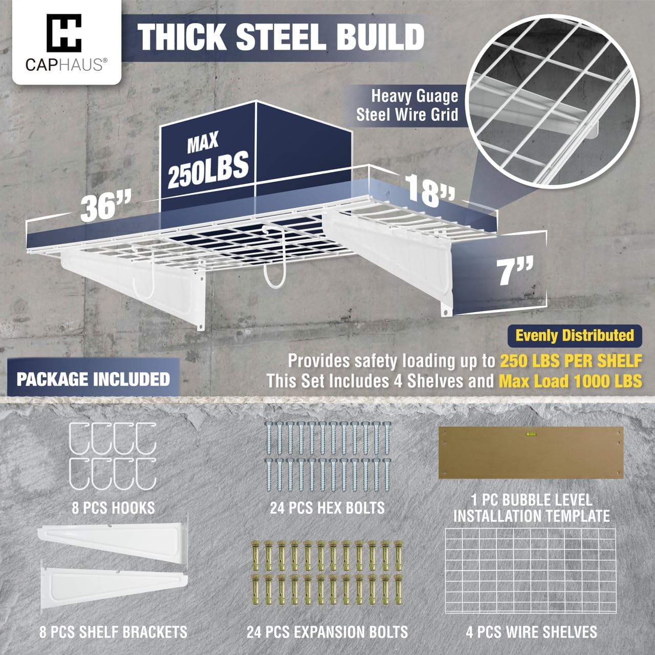 - 🔨 Various Size Choices - This option includes FOUR wall shelves, EIGHT Versatile hooks, and all necessary hardware. Each shelf measures 36 inches in width and 18 inches in depth, providing a total of 144 inches in width. Opt for the silver hex bolt for concrete and wooden walls and choose the golden expansion bolt for secure installation on brick walls. Heavy gauge steel construction provides safety loading up to 250lbs total per shelf, this set providing a total weight capacity of 1000 lbs.