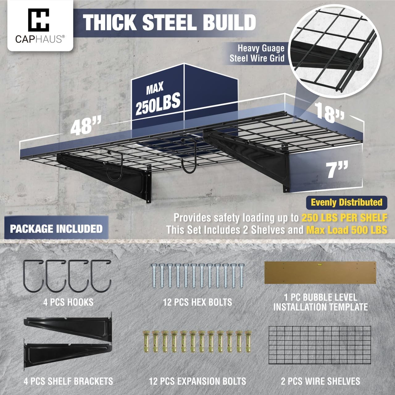 - 🔨 Various Size Choices - This option includes TWO wall shelves, FOUR Versatile hooks, and all necessary hardware. Each shelf measures 48 inches in width and 18 inches in depth, providing a total of 96 inches in width. Opt for the silver hex bolt for concrete and wooden walls and choose the golden expansion bolt for secure installation on brick walls. Heavy gauge steel construction provides safety loading up to 250lbs total per shelf, this set providing a total weight capacity of 500 lbs.