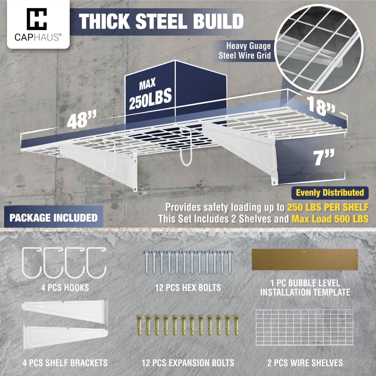 - 🔨 Robust Steel Construction - Our garage wall shelving set includes wire shelving and wall brackets with a durable powder-coated finish, marrying a sleek look with sturdiness. The intelligent design of our steel storage rack allows overhead storage and accessory hook usage, maximizing garage space and organization. We provide high-quality screws that have undergone rigorous testing to ensure durability. Each hook included in the package has a weight capacity of 33 lbs.