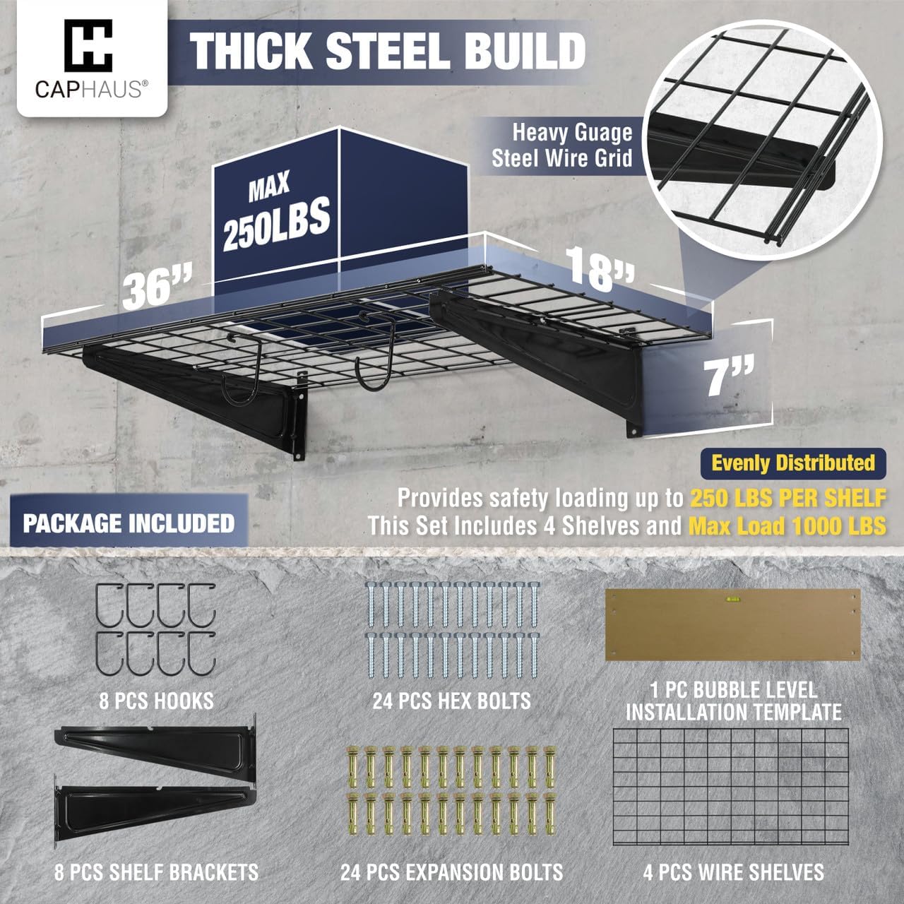- 🔨 Various Size Choices - This option includes FOUR wall shelves, EIGHT Versatile hooks, and all necessary hardware. Each shelf measures 36 inches in width and 18 inches in depth, providing a total of 144 inches in width. Opt for the silver hex bolt for concrete and wooden walls and choose the golden expansion bolt for secure installation on brick walls. Heavy gauge steel construction provides safety loading up to 250lbs total per shelf, this set providing a total weight capacity of 1000 lbs.