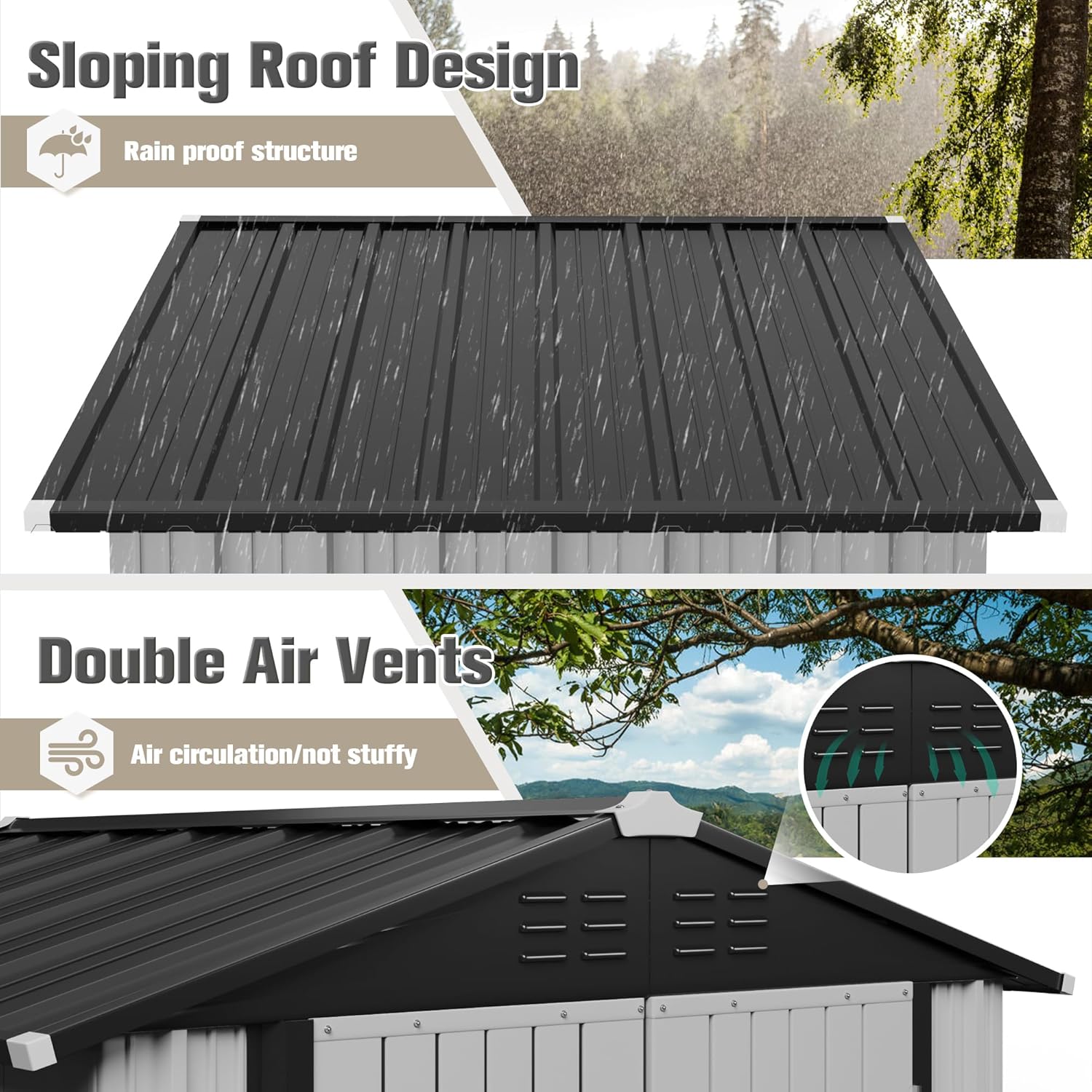 - Multifunctional storage shed: 6’*8’ Storage shed has 245cu.ft storage capacity can be used for multiple purposes, suitable for backyard, garden, courtyard, and other scenarios. It can be used to store tools, bicycles, garbage, and as a pet room.