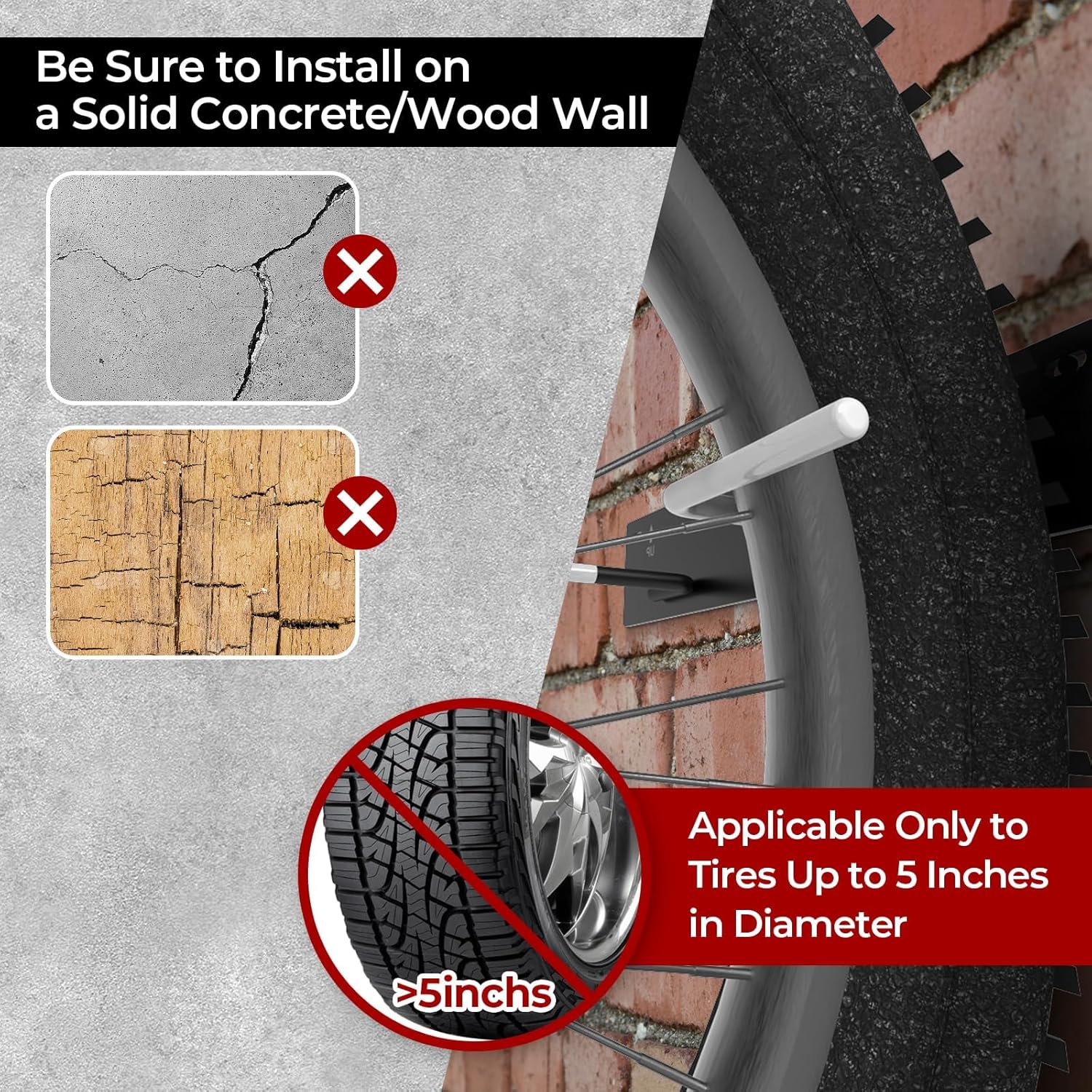 - LONGER HOOKS : To better store your fat tire bike, our fat tire bike rack is designed with hook lengths of 5 inches and a weight capacity of 100 lbs(50lbs per side), providing a great solution for storing your fat tire bike