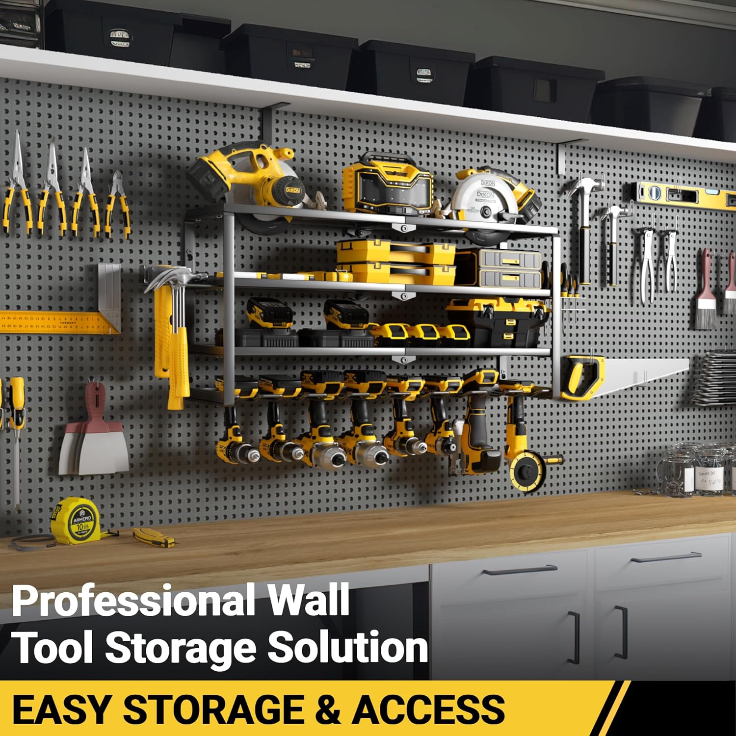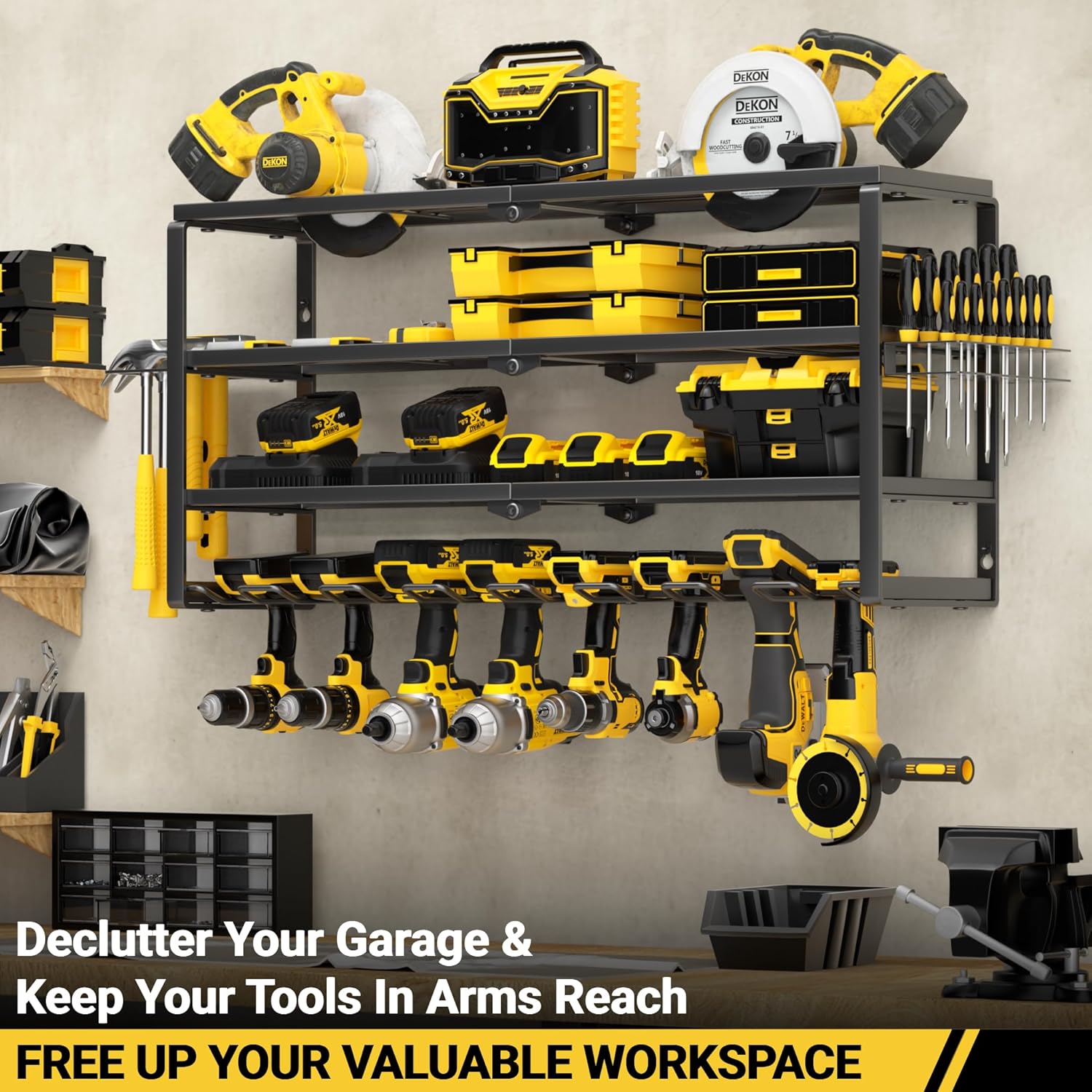 - 【HEAVY DUTY & DURABLE】:Most 4-tier tool rack on the market weigh only around 10 lbs, but we've upgraded ours to a solid 13 lbs by using thicker and stronger metal. This added weight means greater load capacity, improved stability, and longer-lasting durability — ideal for holding power tools without bending or wobbling over time.