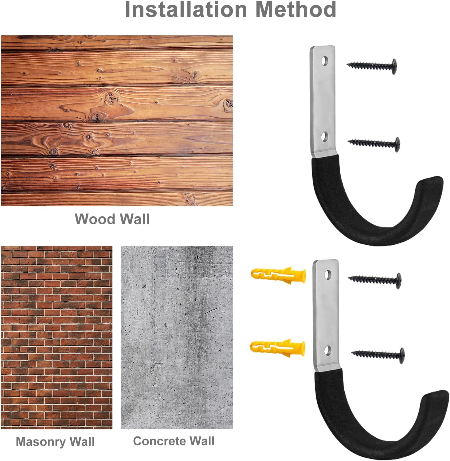 - 【Easy to Install】These shed hooks are suitable for most wall surfaces. They can be easily and quickly installed on drywall, wooden studs, metal studs, concrete walls, brick walls, and other sturdy wall surfaces. Each garage tool hanger comes with two pre-drilled holes. These simple, small j hooks provide a solution to large storage problems in minimal wall space.