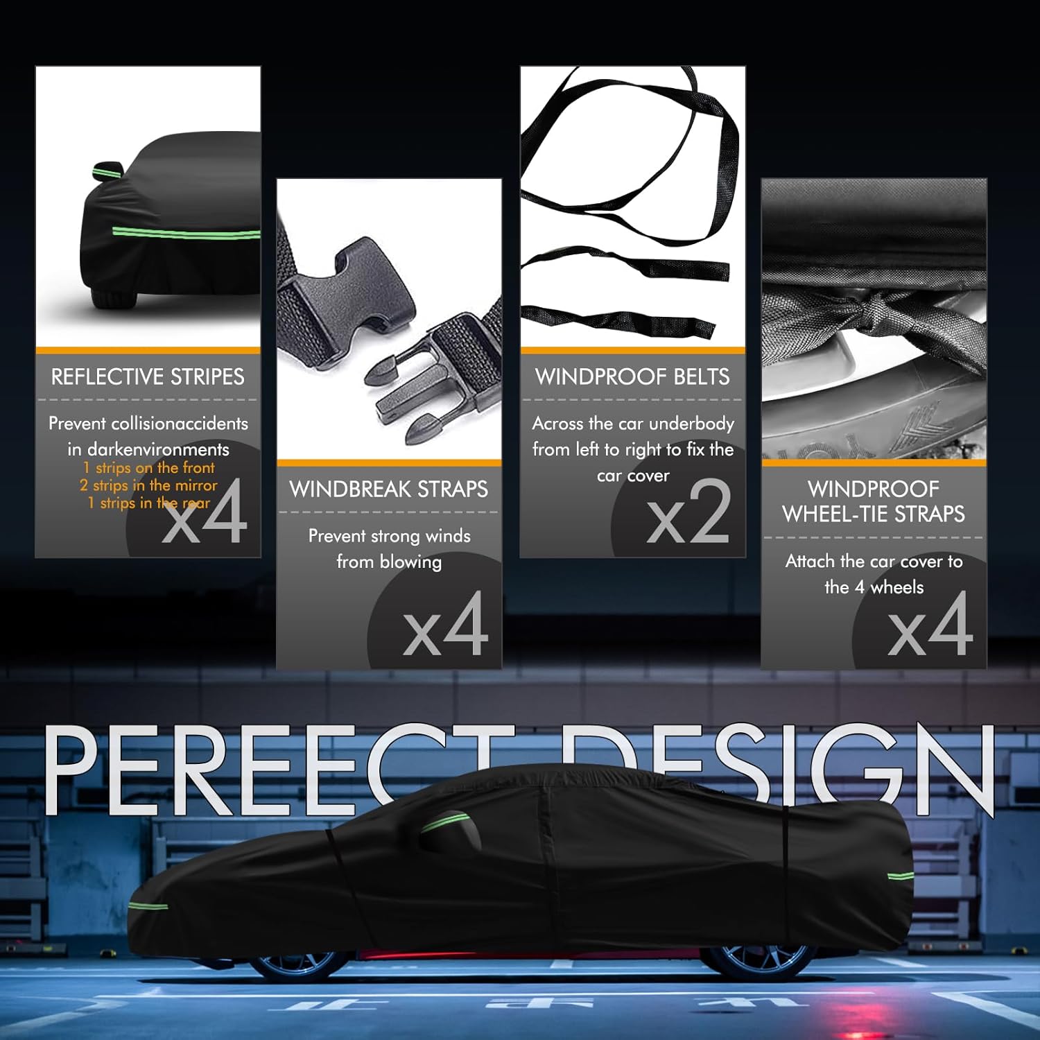 - 🚘【Upgrade Windproof Design】①A windproof fixed buckle pass through the middle of the car for easy fixing; ②Windproof belts at the front and rear; ③4 straps to tie the cover to the four wheels; ④Elastic band at the bottom can easily adjust the size of the cover; ⑤Double stitching ensures that the cover will not tear easily, making it more durable; ⑥The included safety latch secures the cover. Multiple upgraded designs keep your protective cover from being blown away even in strong winds.