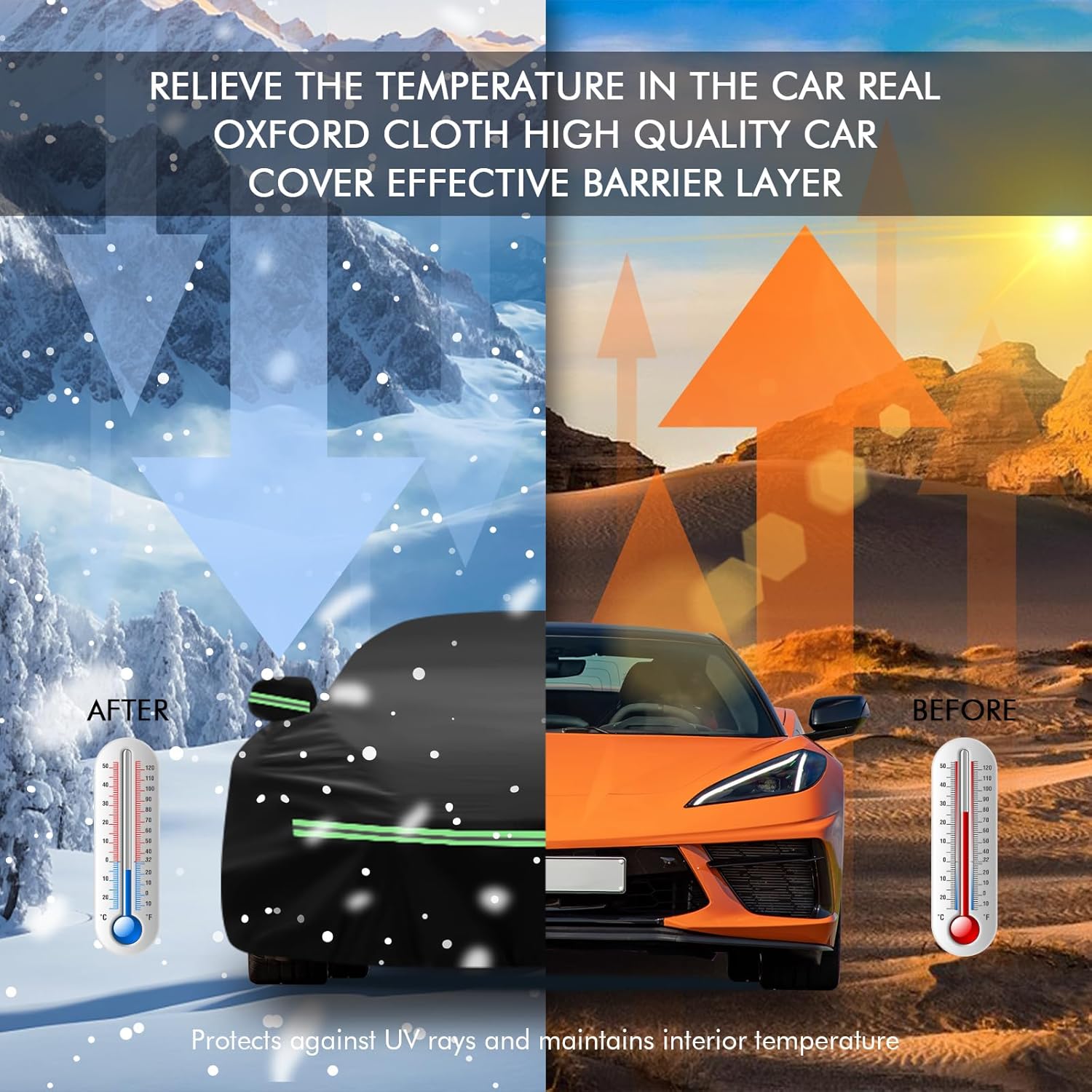 - 🚘【Premium Material】The car cover for Corvette C8 is made of heavy-duty 210D Oxford cloth and waterproof silver-plated fabric, and has multi-layer cotton coating, which can be windproof, dustproof, UV-proof, sun-proof, not easy to tear, and withstand water pressure up to 1600mm. The inner layer also has a thickened cotton backing, which not only fully prevents the paint from being scratched, but also has thermal insulation, which is warm in winter and cool in summer.