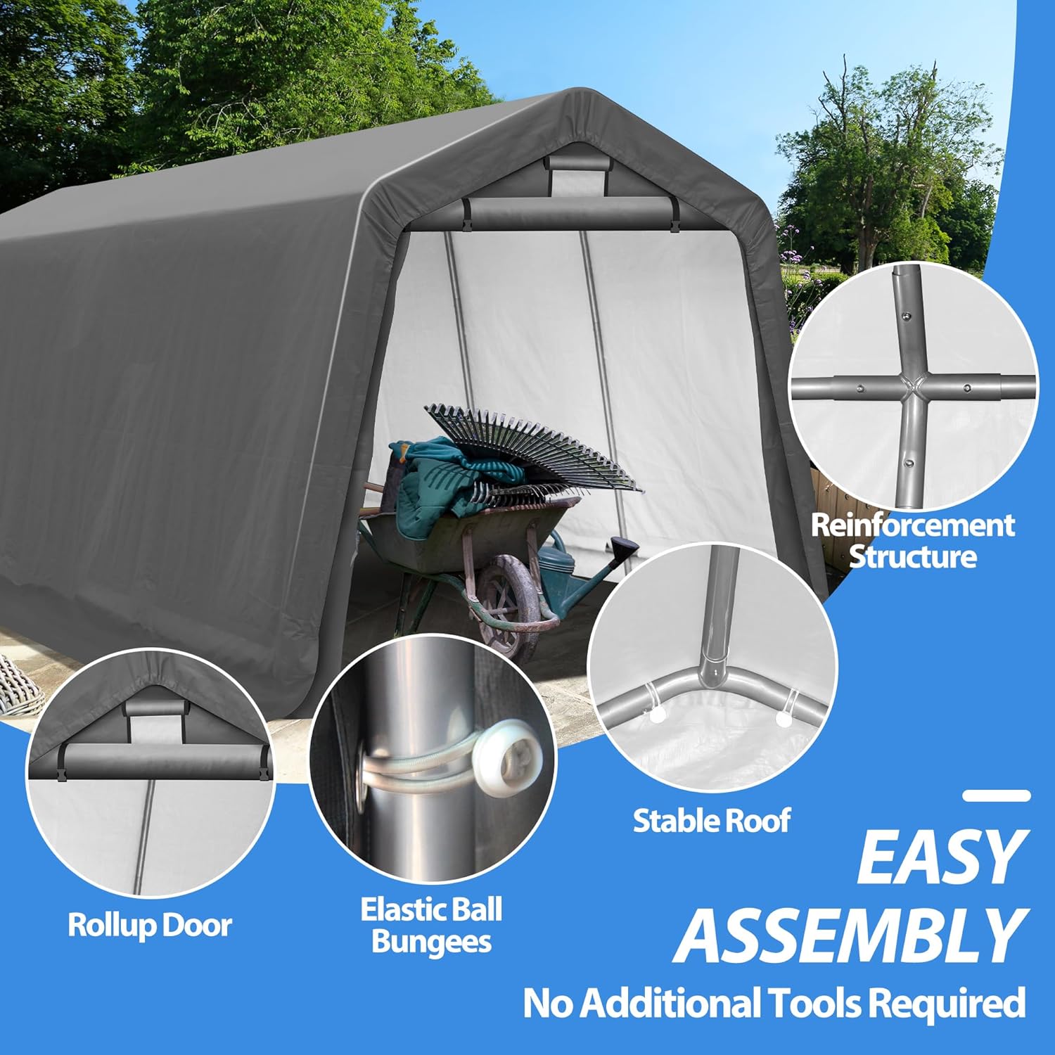 - STURDY FRAME&MORE STABLE: (Please do not use in strong wind and clear the snow promptly.)Our portable shed is made of premium galvanized steel, which can withstand all weather conditions and remain stable even during winds. Comes with extra frame lock, strong rope, ground stakes for stability.