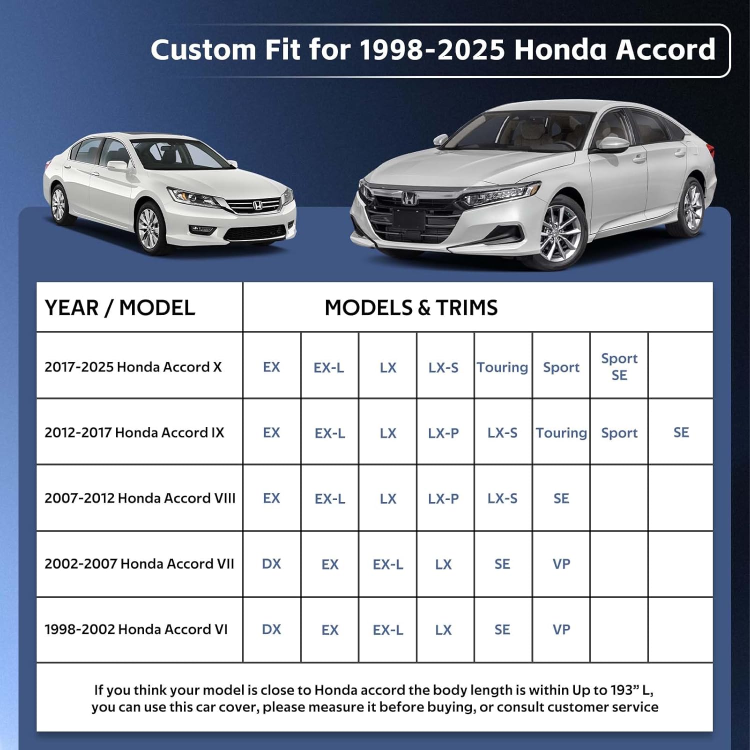 - 【Perfect Fit】— Holthly has conducted experiments to obtain a customized car cover specifically designed for Honda Accord (2001-2024). The custom-like fit of the full cover not only enhances the -aesthetics of your vehicle but also provides superior wind resistance, thereby prolonging the lifespan of the hood. It offers enhanced and long-lasting protection for your car.