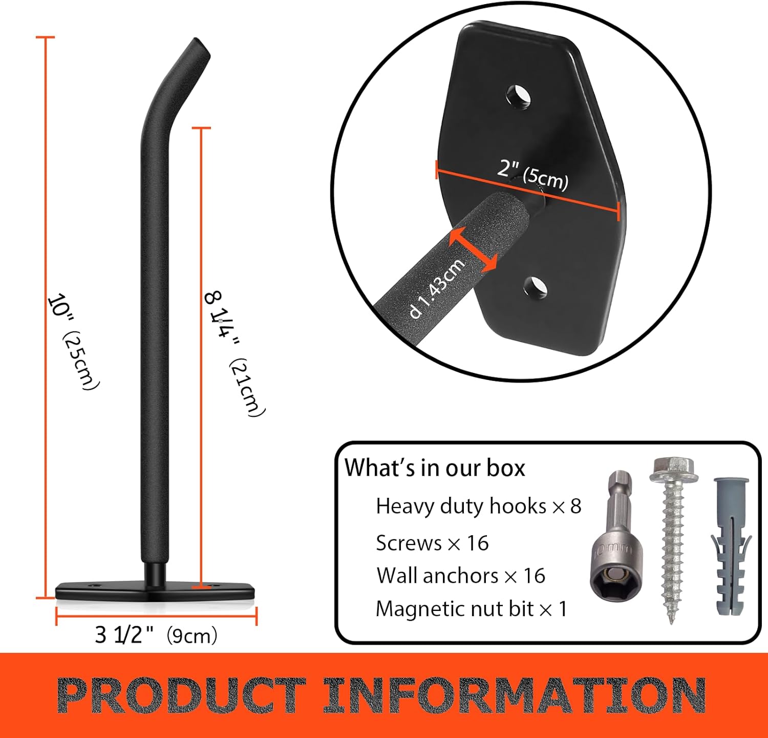 - ▶【PREMIUM MATERIALS】10mm solid steel, black anti-rust powder coating, and black vinyl anti-slip coating ensure durability and tool protection for our garage wall hooks. Suitable for indoor and outdoor use.