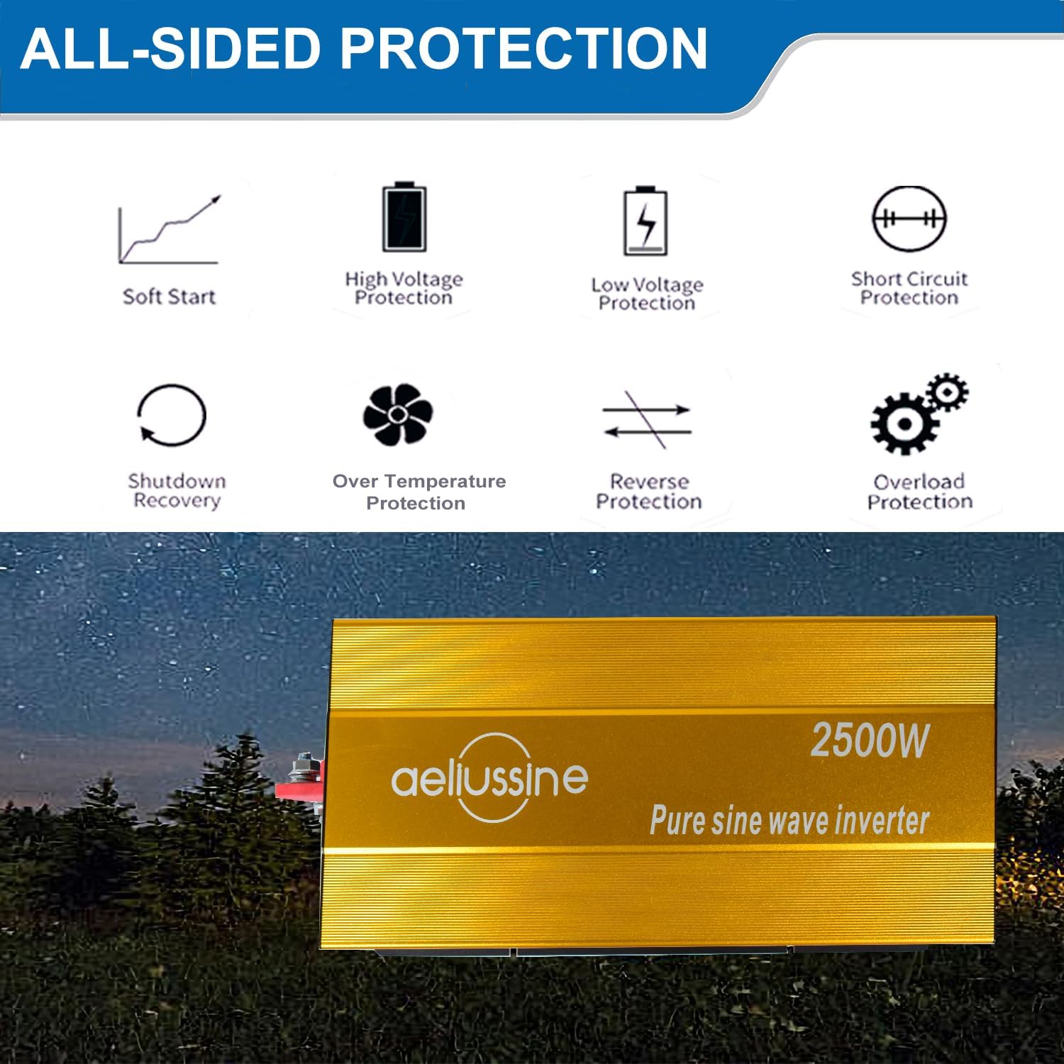 - 【Fully Safety Protections】The pure sine wave inverter has high efficiency and stable performance. It has sound protections including overload protection,over current protection, short circuit protection, battery reverse connection protection, high temperature protection, high or low battery input protection, built-in fuse protection.