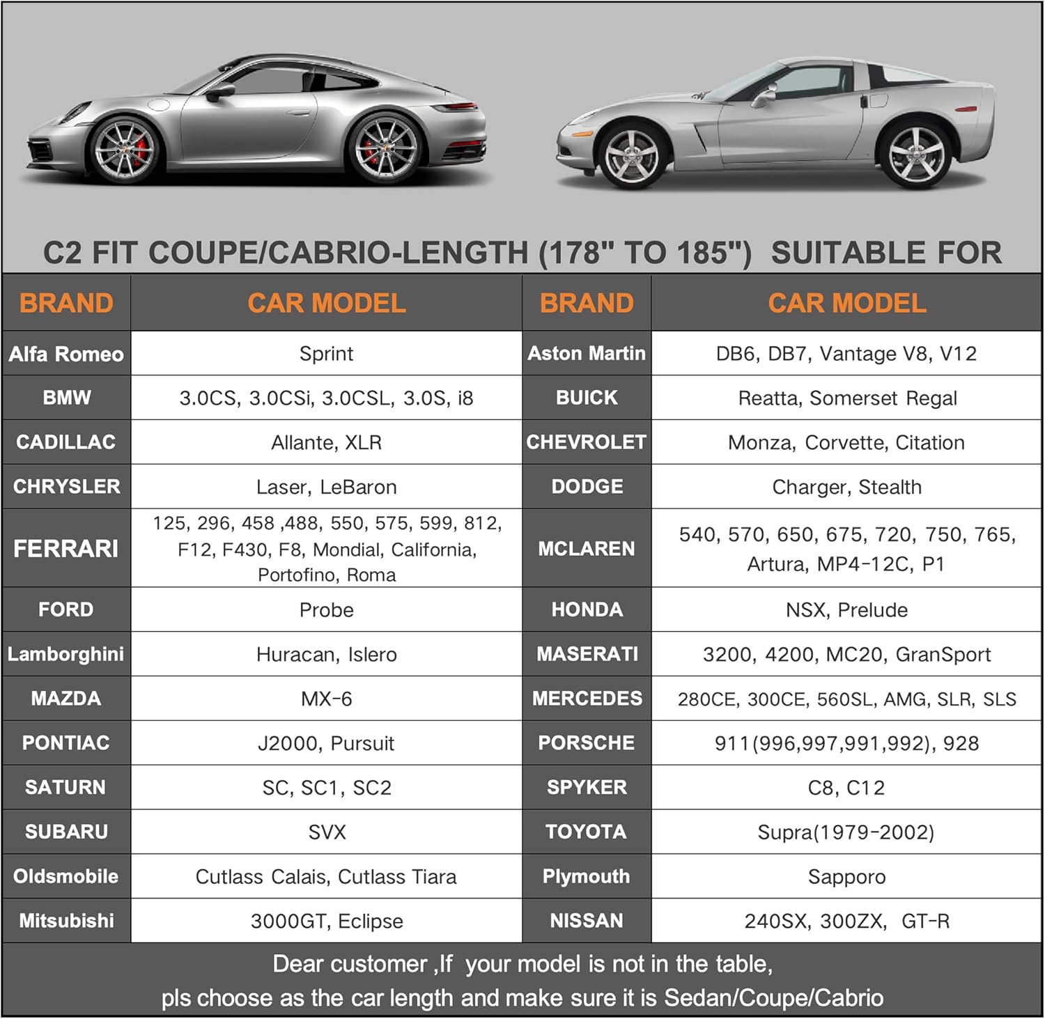 - 【Dimension C2】Universal fit for sedan/Coupe/Cabrio which length is 178-185 inch (Not for hatchback and SUV ). Suitable for BMW 3/4 Series, Mitsubishi lancer/Eclipse, Ferrari California, Lexus IS250C/IS350C etc.