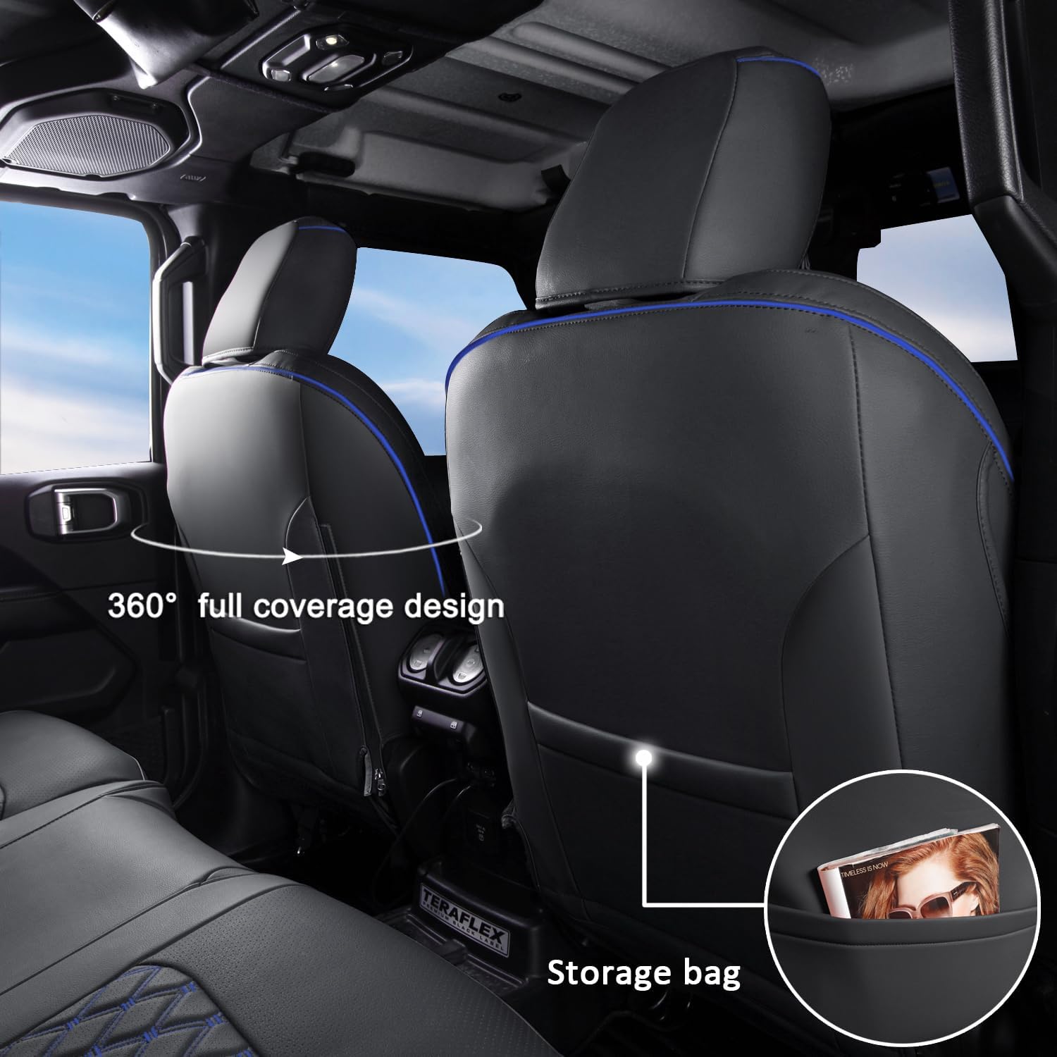 GIANT PANDA Fit Full Set Car Seat Covers for Jeep Wrangler 4 Door JL Sahara Sport Rubicon Unlimited Willys 2018 2019 2020 2021 2022 2023 2024 2025 Without Rear Cup Holder,Faux Leather - (Black+Blue)
