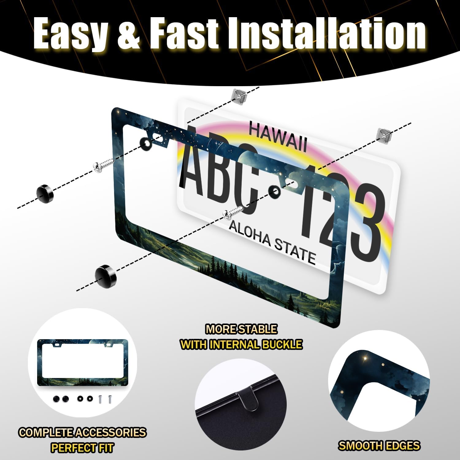 Watercolor Sky Clouds License Plate Frame Beautiful Stars Forest License Plate Holder Stainless Steel Colorful Car Accessory Funny License Plate Decoration Size 12.2"x6.2" with Screws