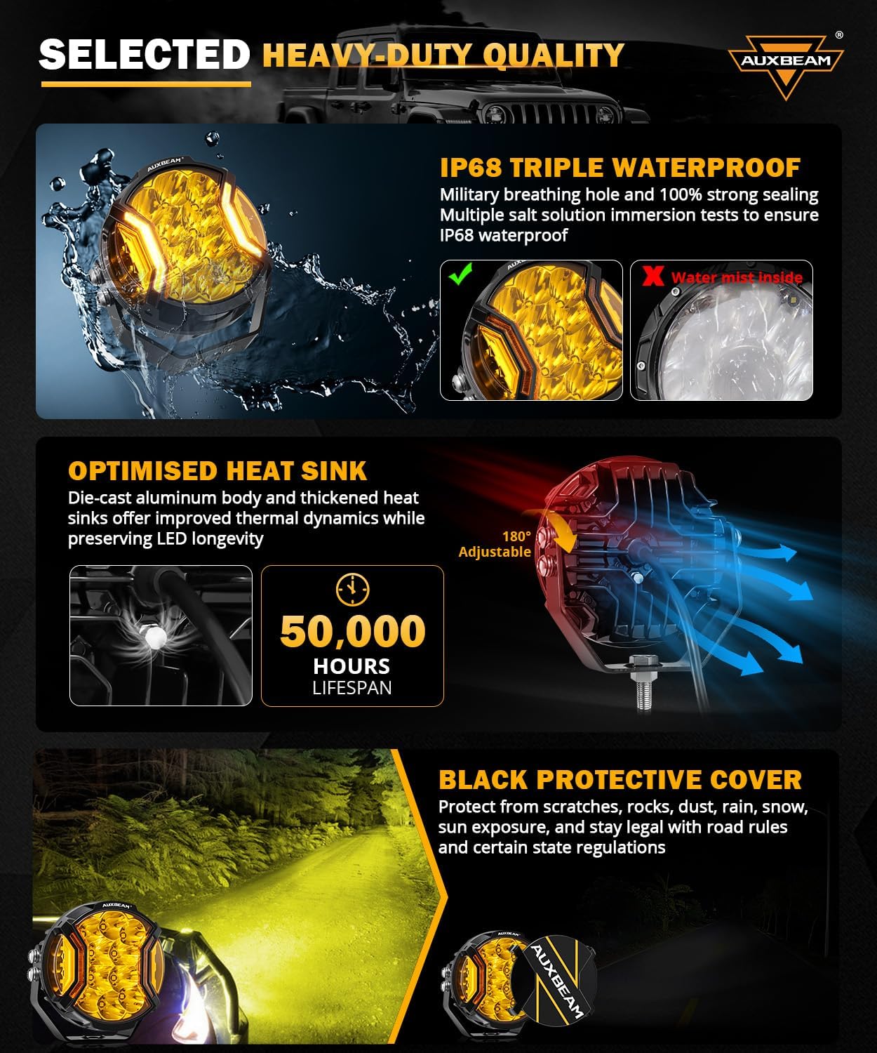 - 【Trustworthy Brand Guarantee】Choose Auxbeam to join a legacy of trusted performance and rugged dependability. 𝐖𝐡𝐚𝐭'𝐬 𝐢𝐧 𝐭𝐡𝐞 𝐛𝐨𝐱 [2* round offroad lights, 2* black covers, 1* DT wiring harness, 1* mounting kit, 1* user guide, 1* sticker.] 24-month guarantee and 24/7 customer support, we're always here to be your backup.