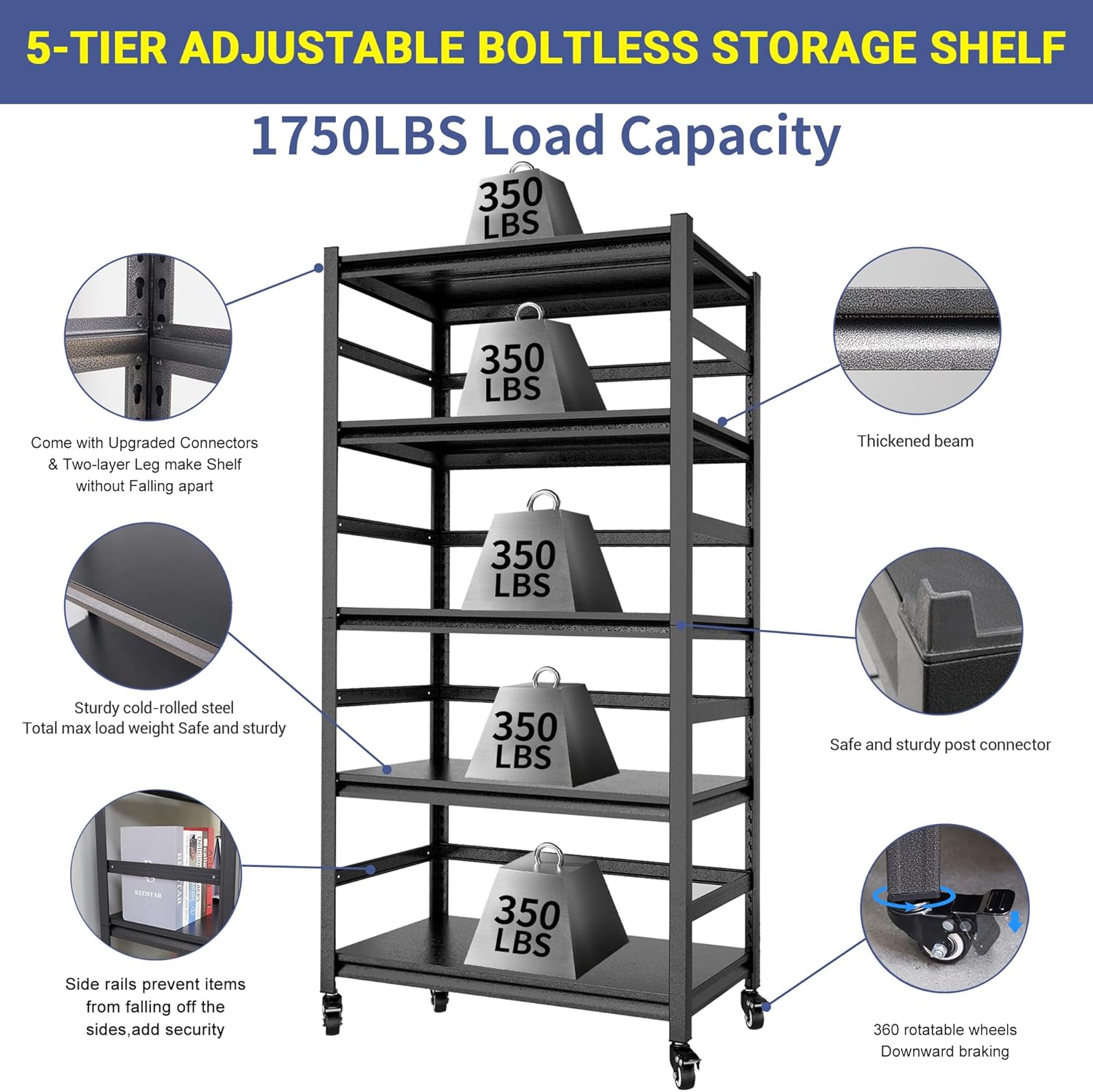- 【1750LBS Load Capacity】: Our 5-Tier utility shelves are made of the high-quality metal frame, each shelf is built with thick steel. The maximum capacity of the industrial garage storage Shelf is up to 1750lbs totally, 350lbs per shelf, providing reliable support to store much more stuff and tools in your garage or warehouse.