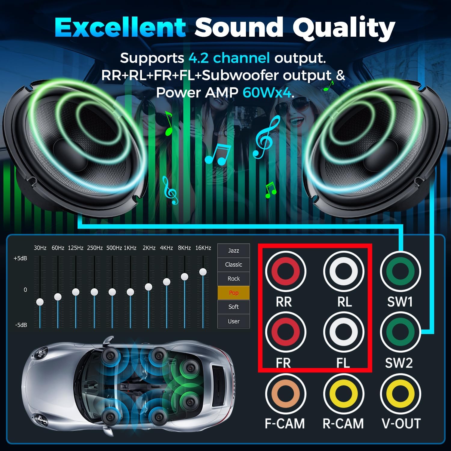 - 4.2 Channel Output: This car radio supports 4.2 channel output. (Rear Right/Left Speaker output, Front Right/Left Speaker output and 2 High RMS Power Subwoofer output.) You can enjoy the outstanding sound quality and breathtaking bass effects. It is equipped with tone control function that allows you to adjust the music effect. Made with high-quality materials and advanced technology, it is stable and durable. Perfect for music enthusiasts and drivers who enjoy music in their cars.