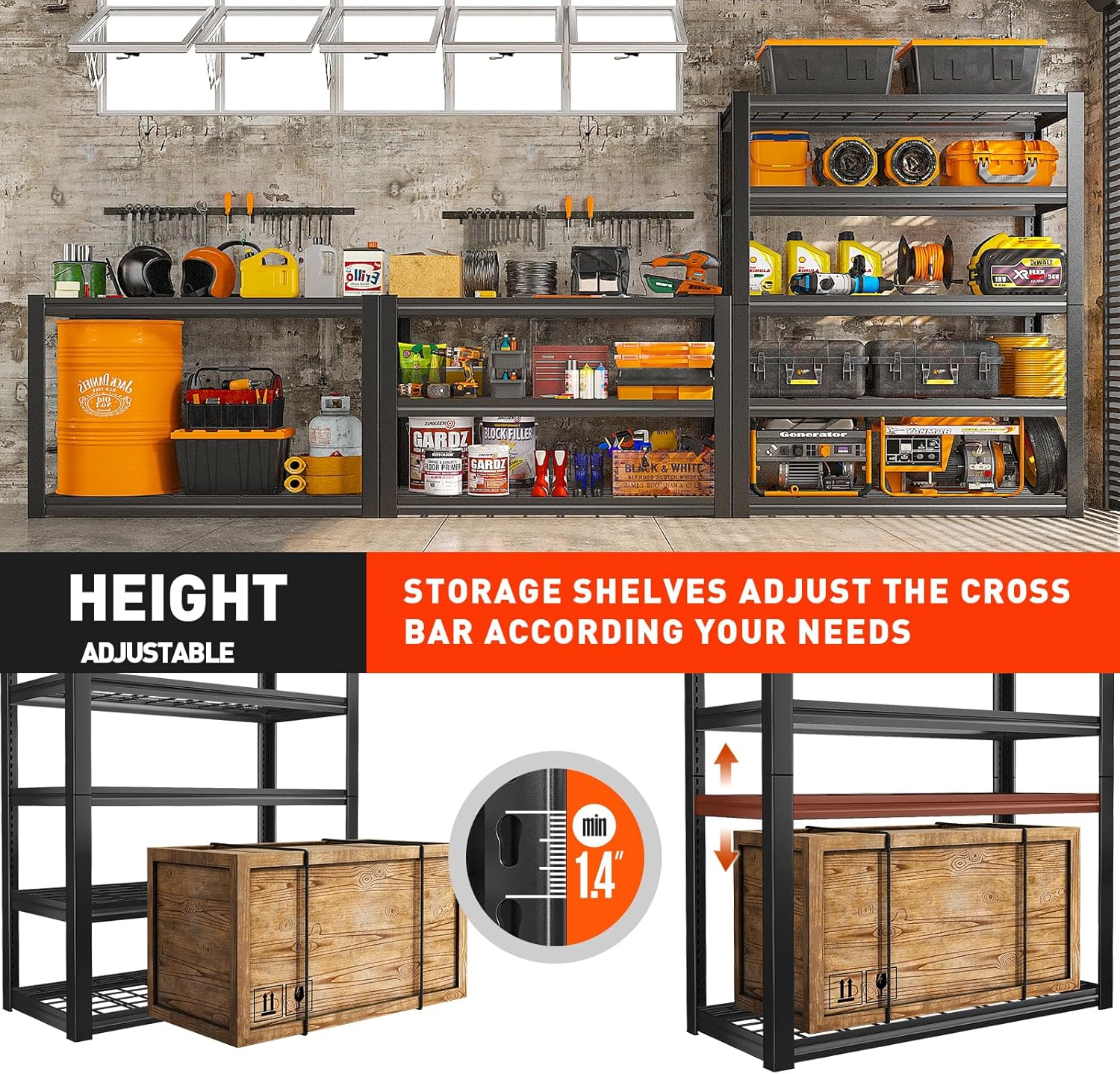 - 【Adjustable Storage Shelves to Meet Different Needs】You can use your imagination to customize your own space. Metal shelves for storage is designed with adjustable connectors. The height of each layer is not only adjustable by moving the crossbar meet the different heights of needed, but also the shelf can be assembled or disassembled into several different metal shelving. Two garage shelf can be used as workbench can be used for garage