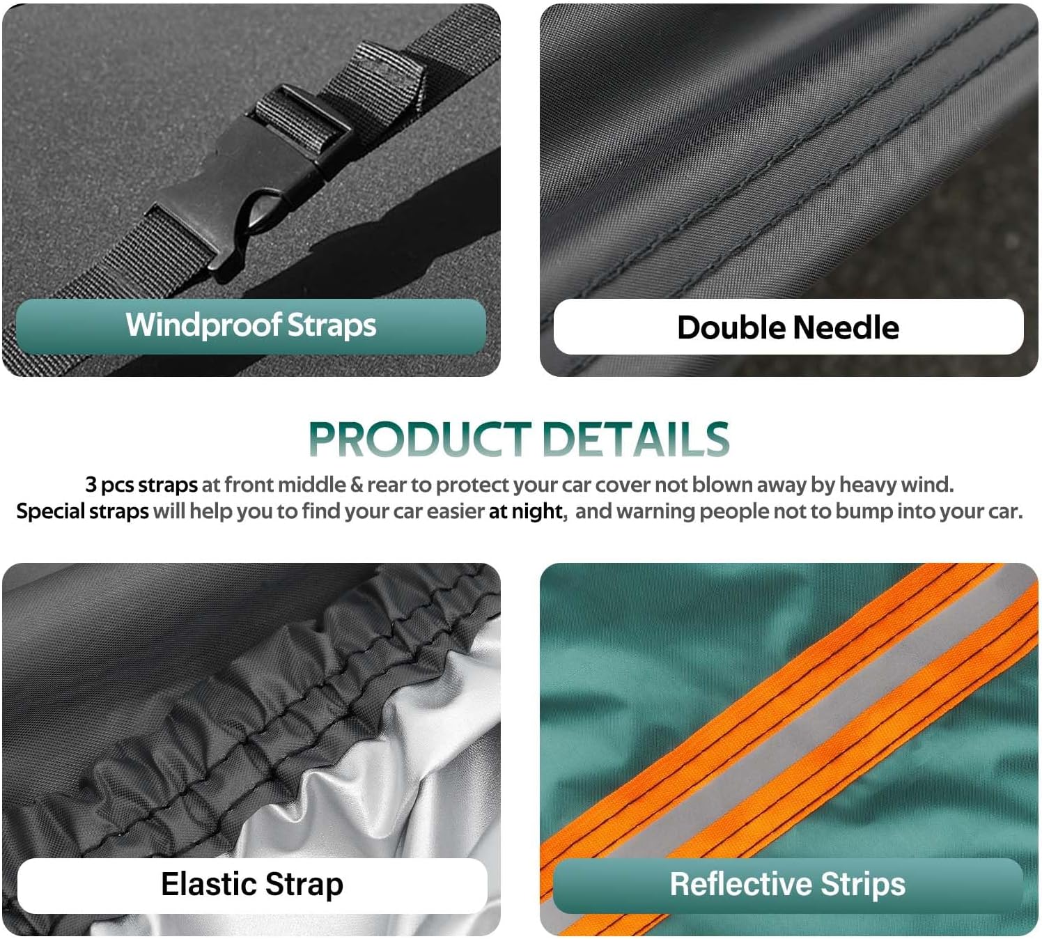 - 【PRODUCT DETAILS:】: 1. The car cover has three pairs of windproof straps, each pair of windproof straps is reinforced, even in windy weather will not be blown away. 2. With fluorescent orange designs, it can glow at night to avoid accidental impact.