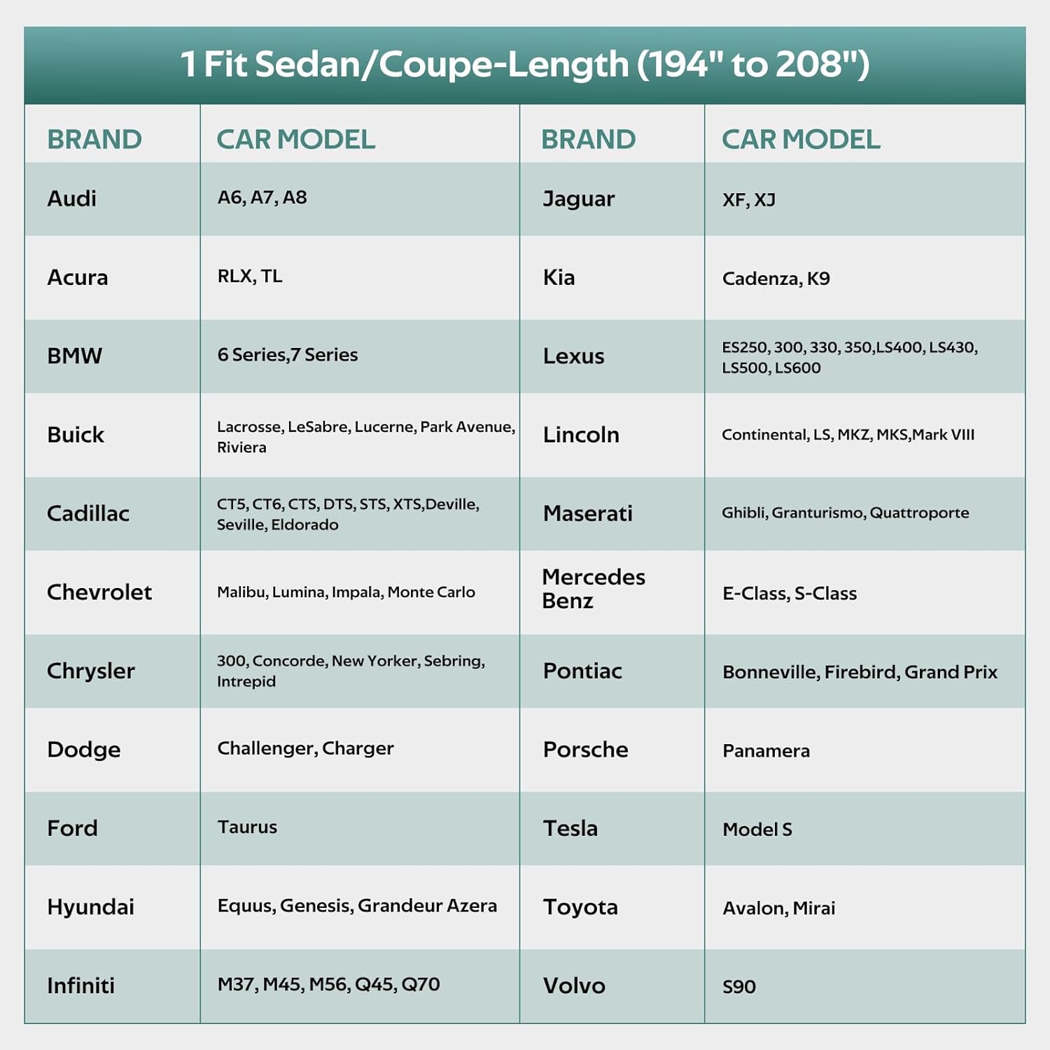- 【CHOOSE THE RIGHT MODEL】: Molebt car cover fits Sedan & coupe 194 to 208 inch. For example Dodge Charger/Challenger, BMW 7 Series, BMW 5 Series, Jaguar XJ, Lincoln MKZ, Ford Taurus, Toyota Avalon, Chrysler 300, Audi A8, Buick Lacrosse, Tesla Model S, etc.