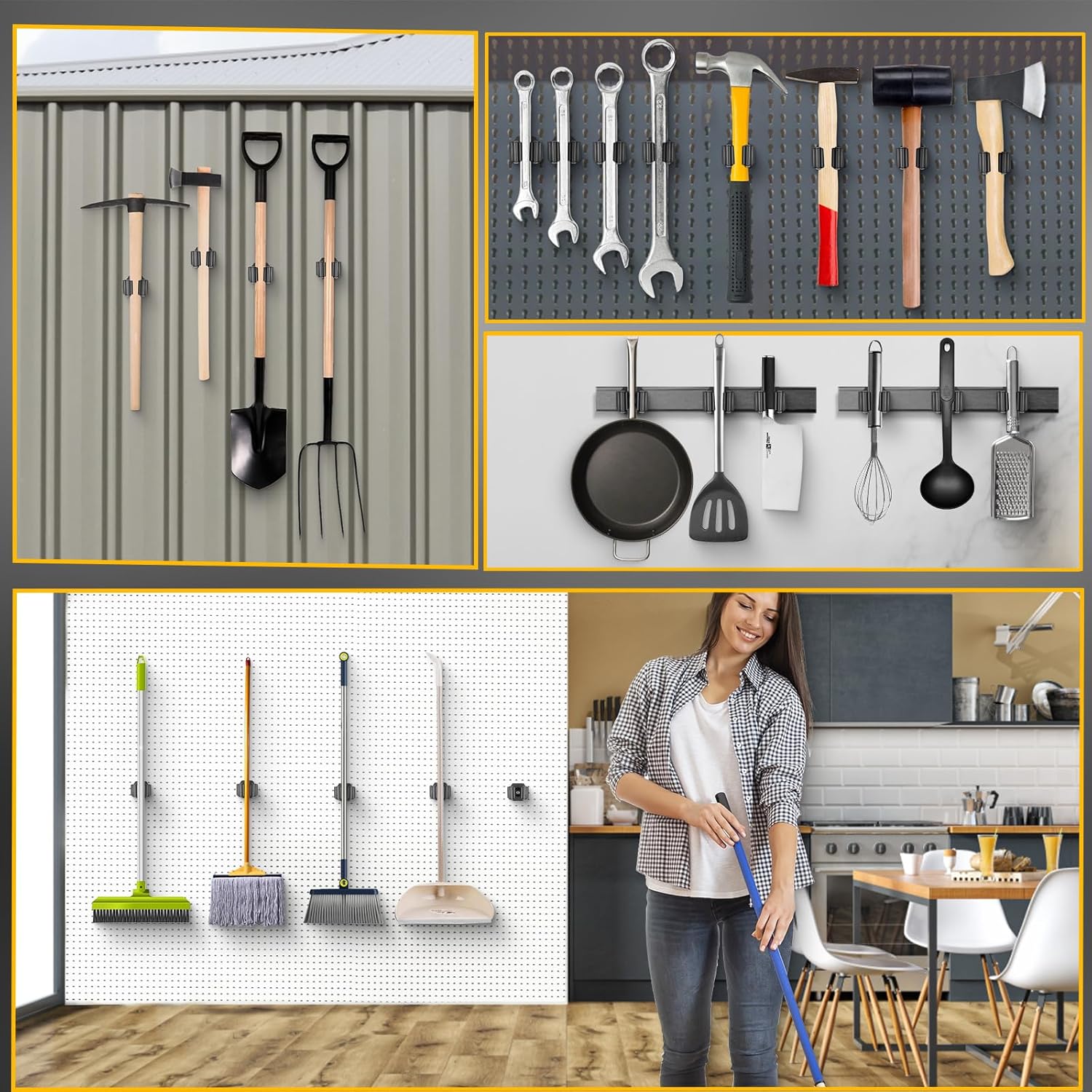 - Easy to Use: Quick-access magnetic broom holder heavy duty,the adjustable hook will automatically lock the handlers in different thicknesses without slipping with the rubber roller and triangular clip design, convenient to take out.