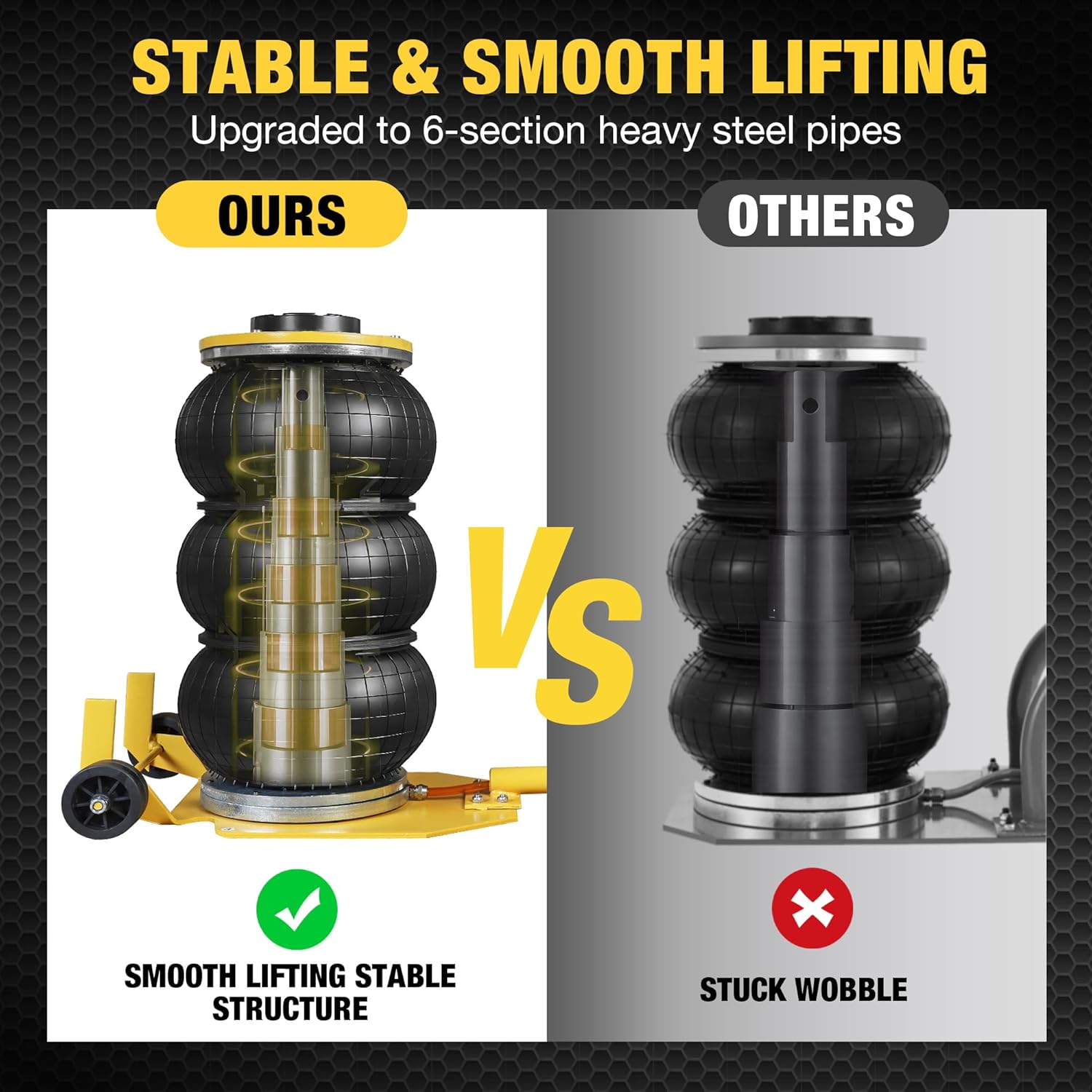 - Built to Last: We've taken durability to a new level! Our Air Bag Jack is equipped with an upgraded top with a thicker, non-slip rubber pad to provide a larger contact surface for a more even distribution of force. In addition, the three layers thick airbag and the anti-rust electrostatic spraying technology ensure long life. Rely on this sturdy, robust jack for long term, reliable performance.
