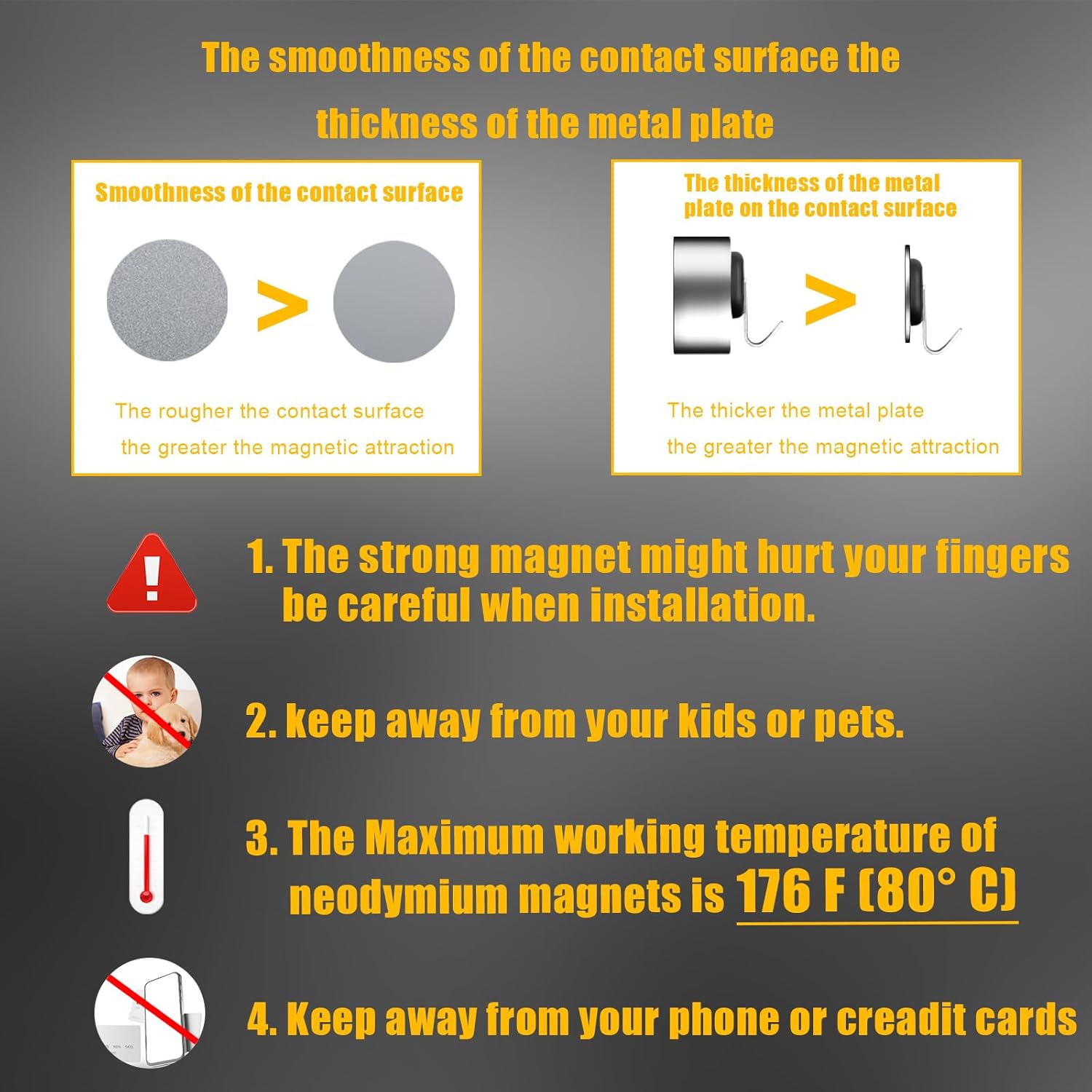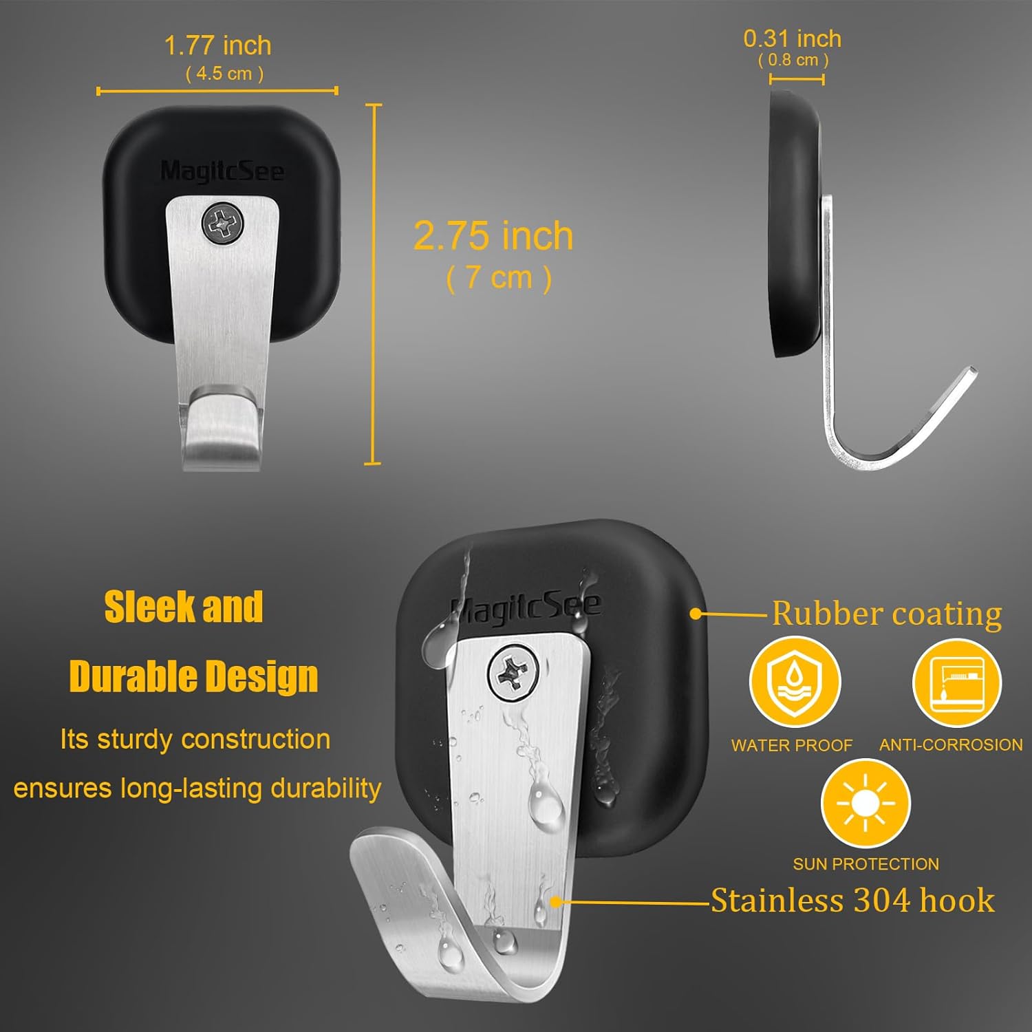- Sleek and Solid Design: Crafted from the most powerful industrial neodymium iron with rubber coating , the stainless 304 hook,sleek and modern design that seamlessly blends with any environment. Its sturdy construction ensures long-lasting durability.