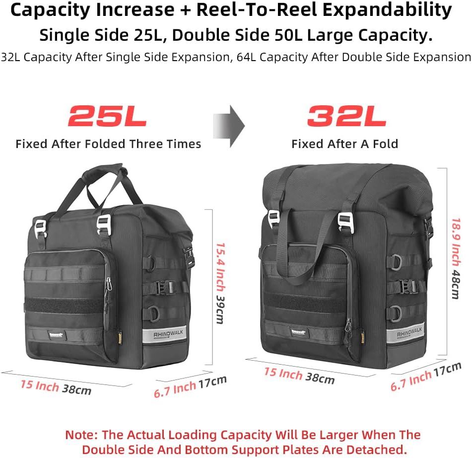 - Expandable Capacity: Size: 15"*6.7"*15.4". Weight: 6.17lb. The capacity is about 25L when folded three times on one side, this bag is a package, and you need to buy two for one pair