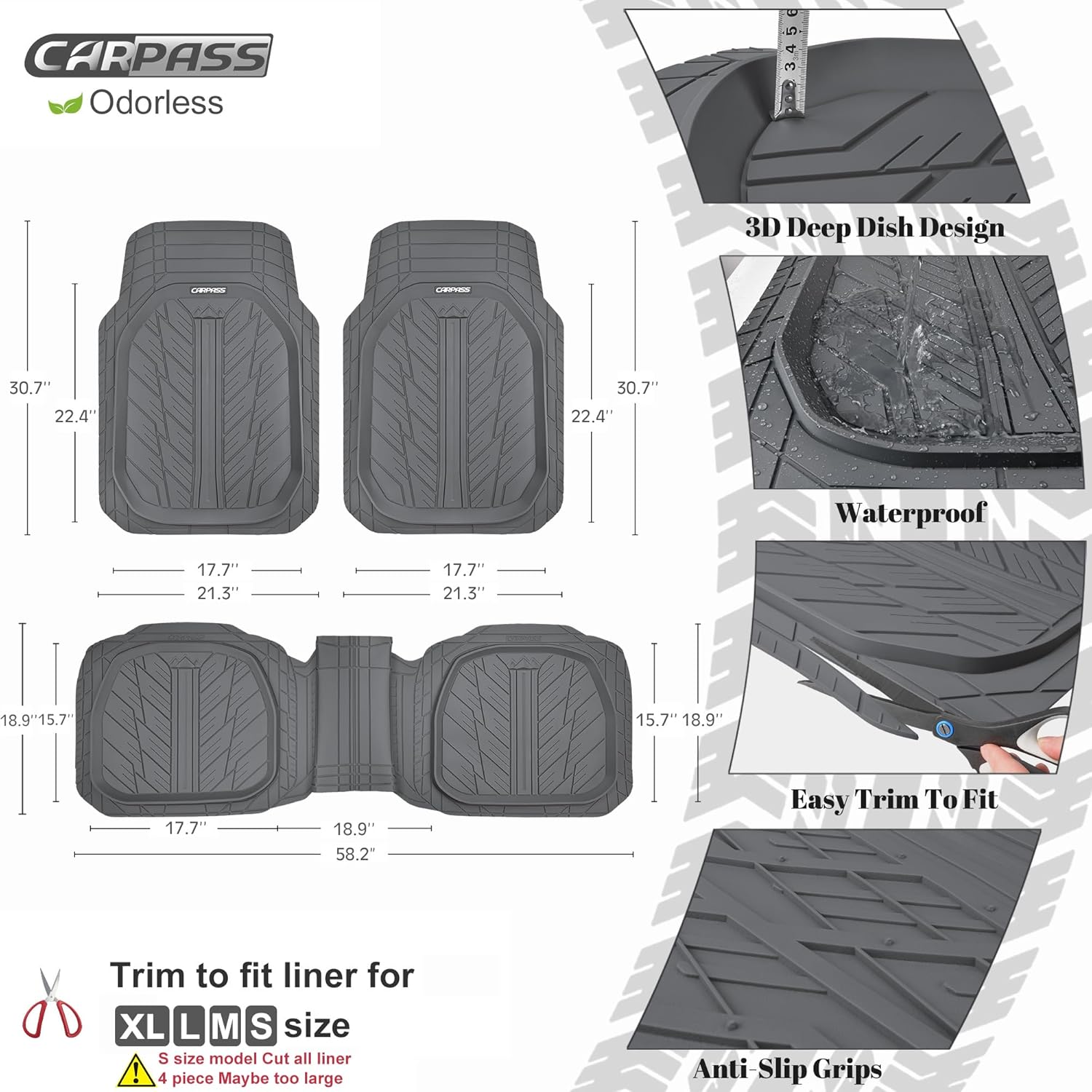 CAR PASS DeepDish Floor Mats for Cars Full Set,Heavy Duty Rubber Car Mats 3-Piece,Universal Waterproof Trim-to Fit Automotive Floor Mats for Truck Van SUV, Durable All-Weather Car Mats(Pure Gray)