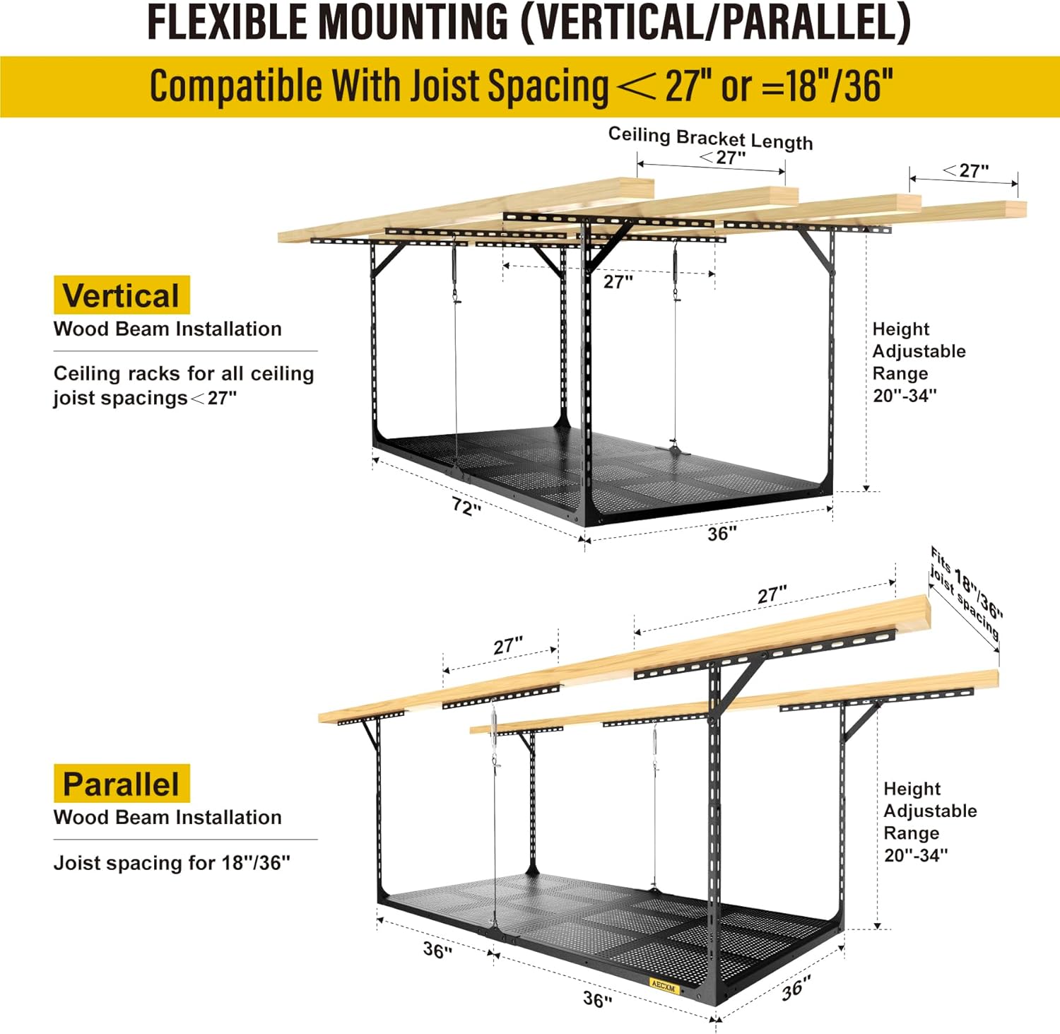 - FREE ADJUSTMENT: (L)3ft/36" x (W)6ft/72"; The Garage Overhead Storage Rack can be adjusted from 20"-40" in height. The center is fixed with wire rope combined with elastic knurled screw set, Which can be adjusted at will for easy installation and disassembly to ensure sufficient load bearing and parallelism of the Ceiling Storage Racks