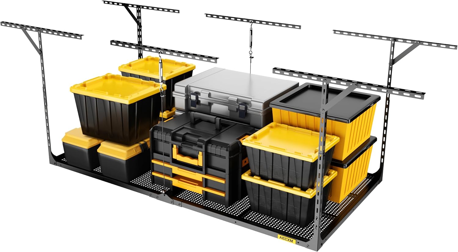 - STABLE AND SAFE: AECXM Ceiling Storage Racks is uniquely designed to provide a reinforced and safe design for each connecting pivot point, Preventing the ceiling storage shelf from shaking, Deforming and sinking, With a safe load capacity of up to 680 lbs