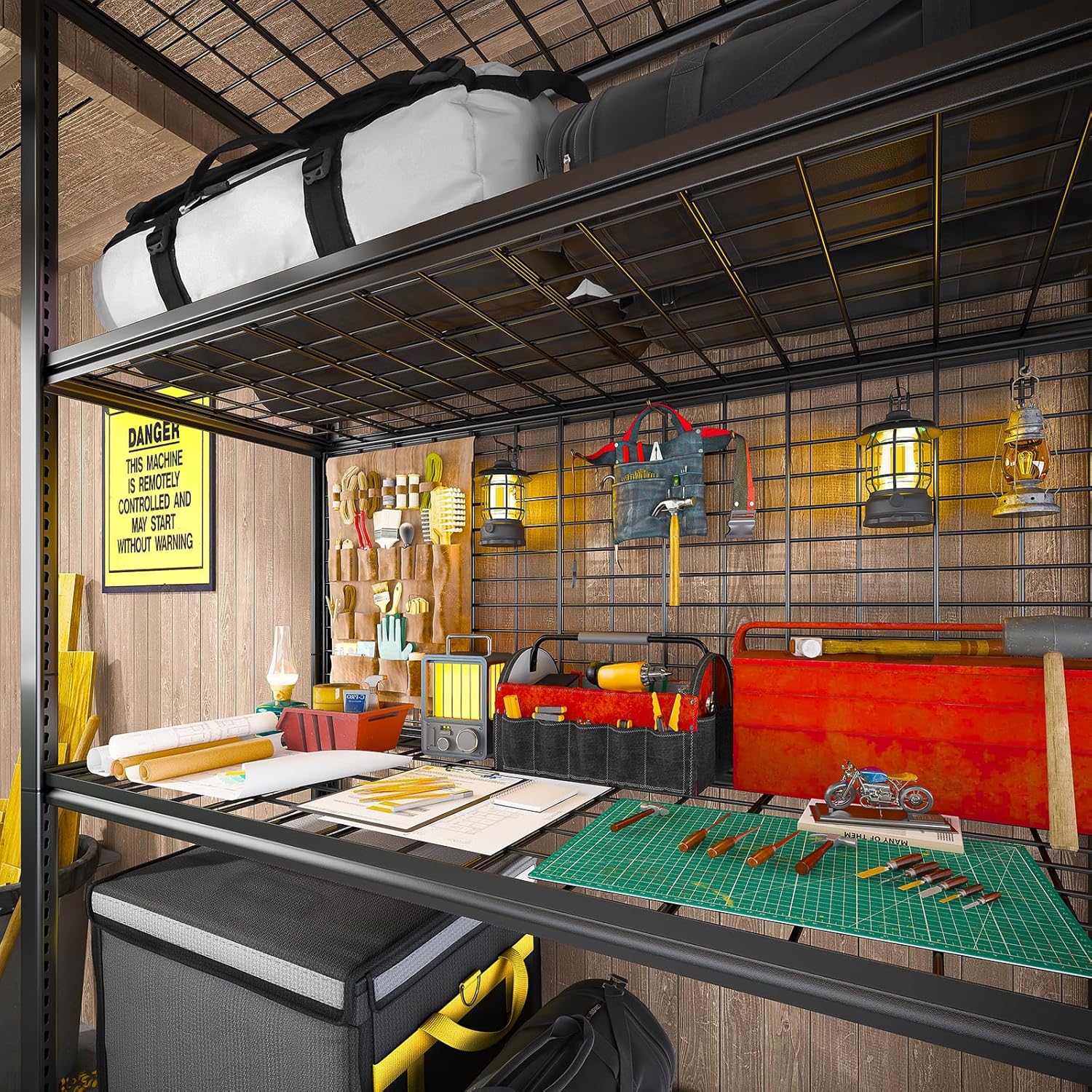 - 【6+1 Grid Plates for Garage Storage Shelves】The 6-tier garage storage shelves contain 7 grid plates, and the extra mesh piece can be installed behind any layer of storage shelving, used as a hanging board, and can hang any tools you need to reach at any time, which is super convenient, so that the storage shelves garage heavy duty can not only hold a lot of things, but also be used as a workbench.