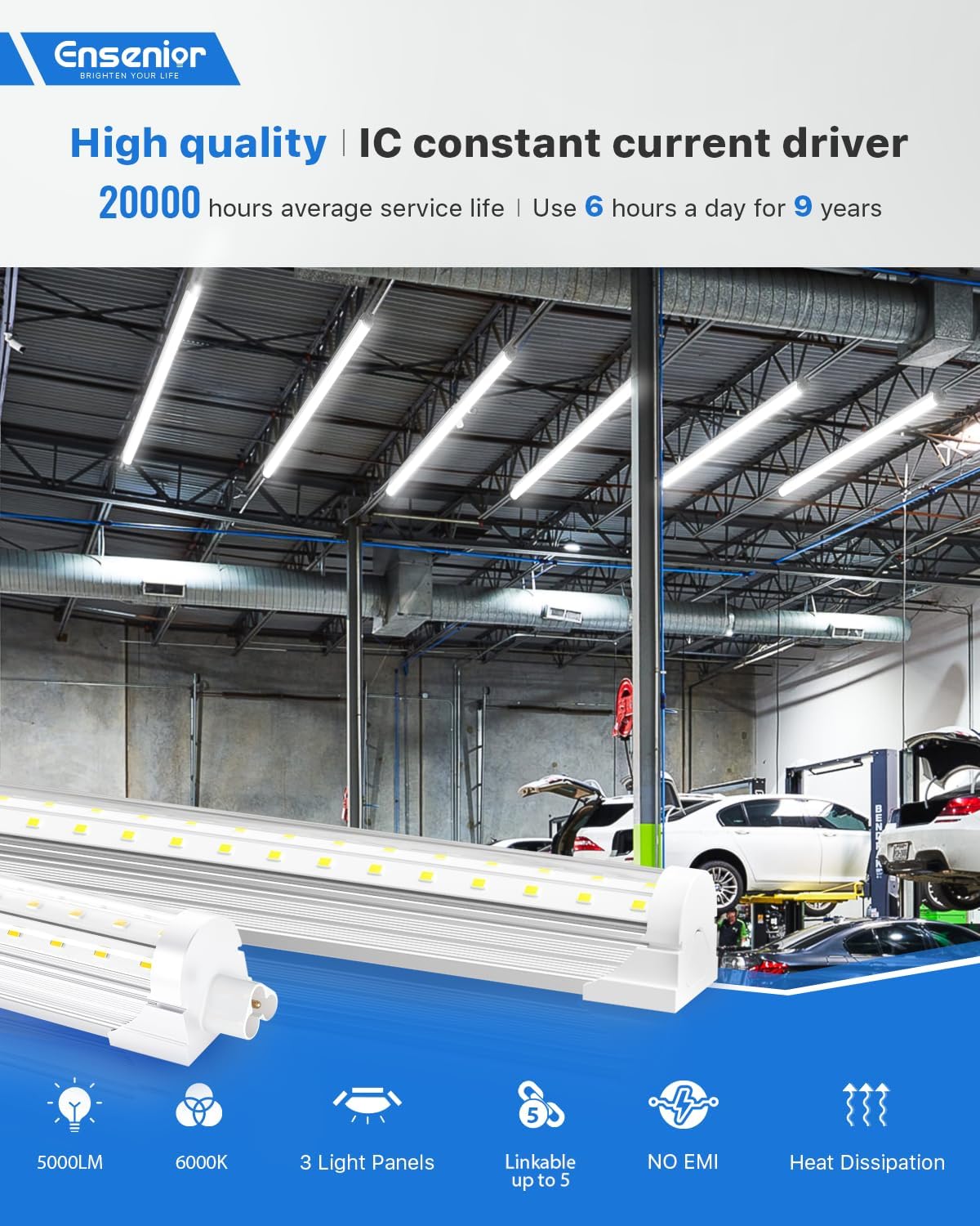 Ensenior 6 Pack 8 FT Led Shop Lights, 6000K Clear White, 10000LM Super Bright, 72W Equivalency 936W, Commercial Bay Lighting, U-Shaped Linkable Shop Lights Plug in for Garage, Workshop, FCC Certified