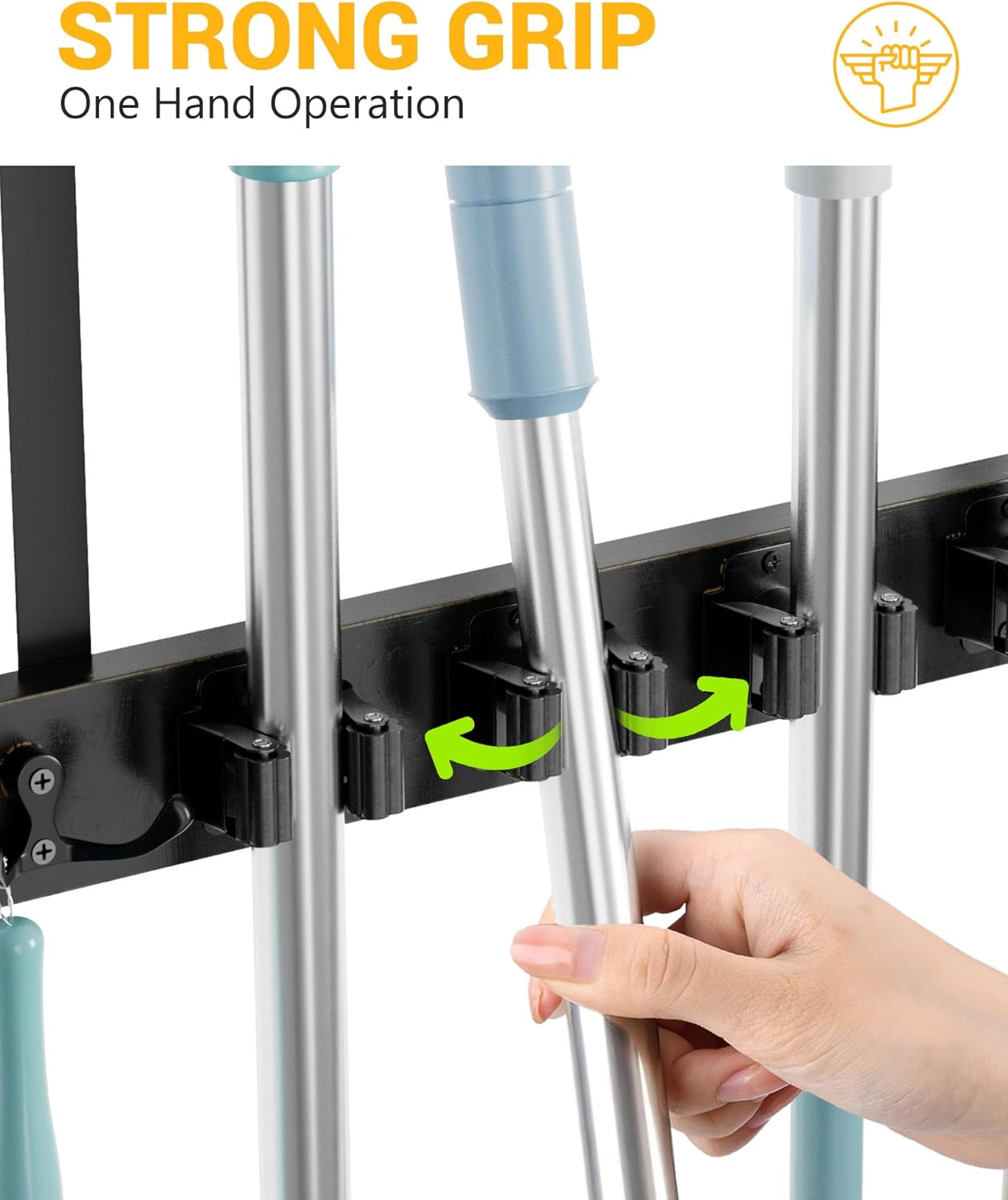 - Easy to Grab with One Hand: Long-lasting over the door broom holder features dual hooks and rubber roller clamps, securing cleaning tools up to 30 pounds. From bulky mops to lightweight brushes, items stay put for quick use. Spring-loaded, double rubber-gripped slots prevent sliding, ideal for wet mops and dirty rakes. Its unique design allows for one-handed operation, placing or removing tools effortlessly. Ensures a tidy space and simplifies cleaning by combining strong hold with convenience.