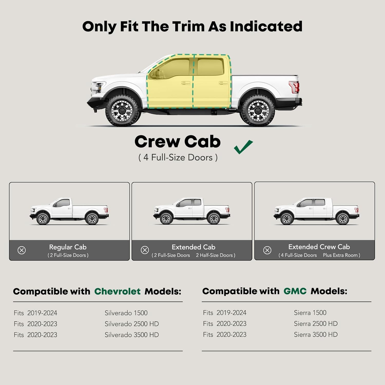 - Confident Fitment: Wheel-to-wheel side steps are compatible with the Chevrolet and GMC Models: Silverado/Sierra 1500 2019-2024, Silverado/Sierra 2500 HD 2020-2024, Silverado/Sierra 3500 HD 2020-2024, Crew Cab(4 Full-Size Doors), With 6.5 FT Standard Bed Only