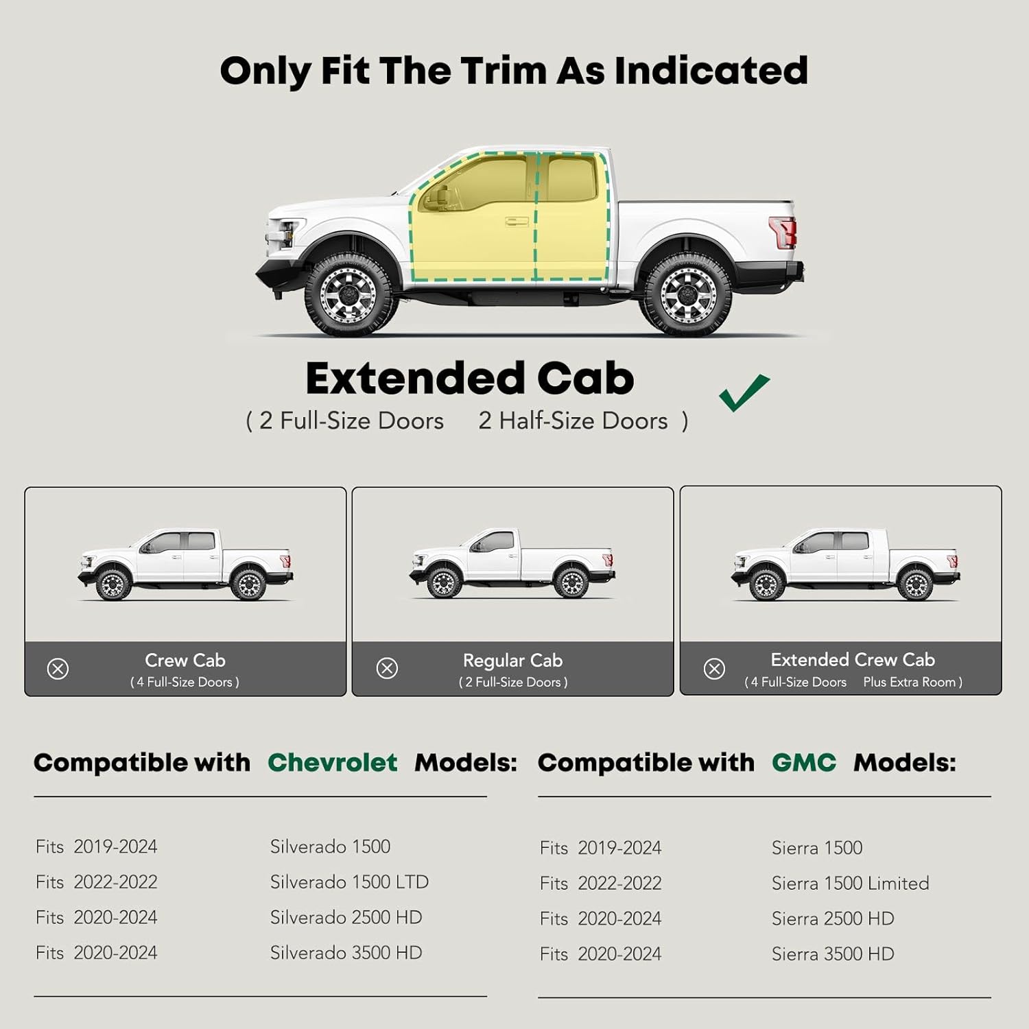 - Confident Fitment: Cab length side steps are compatible with the Chevrolet and GMC Models: Silverado/Sierra 1500 19-24, Silverado 1500 LTD/Sierra 1500 Limited 22, Silverado/Sierra 2500 HD & 3500 HD 20-24, Extended Cab(2 Full-Size Doors with Half Doors), Exclude 2019 1500 LD
