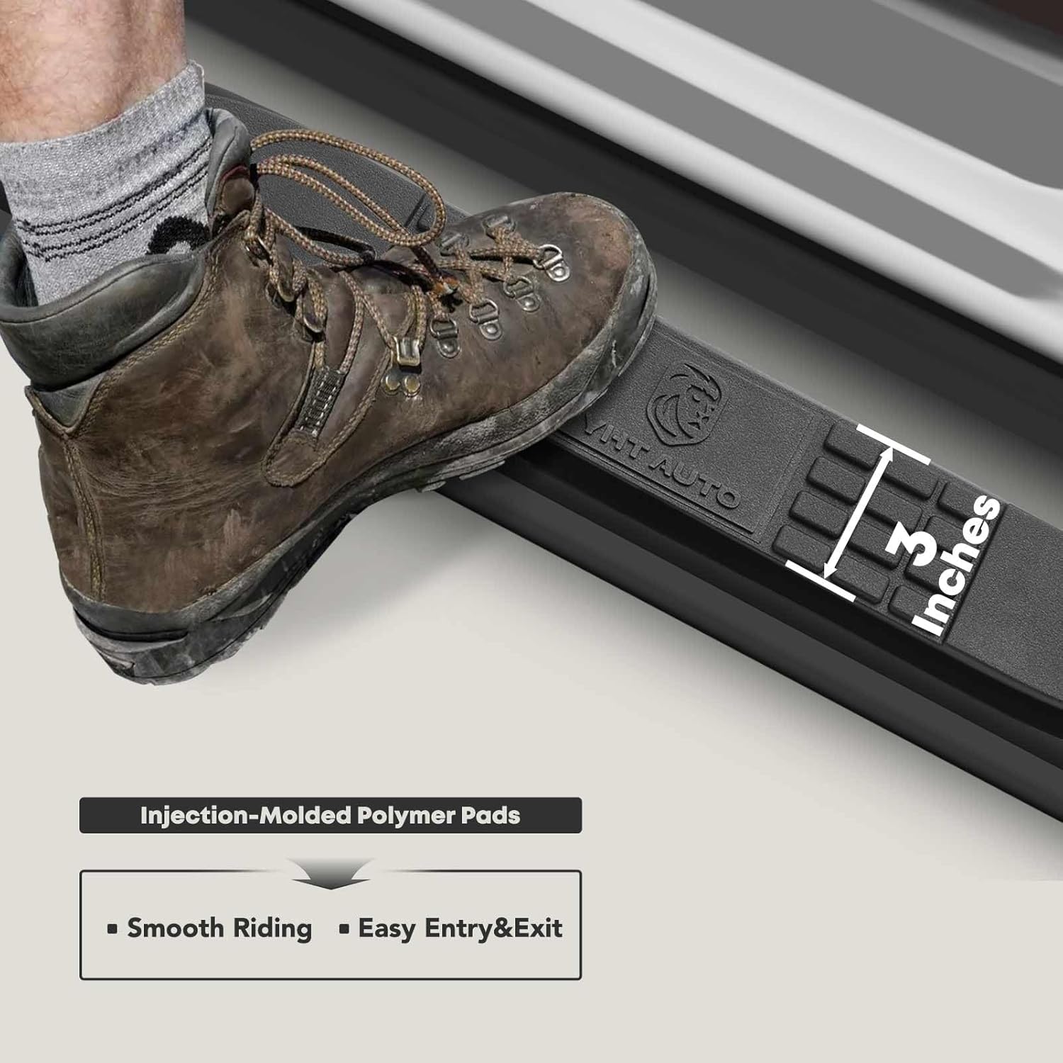 - Frame Mount: Running boards come with all necessary brackets, bolts, and nuts for installation, eliminating extra drilling if your vehicle has preexisting mounting holes. The packaging features five layers of reinforcement to prevent deformation