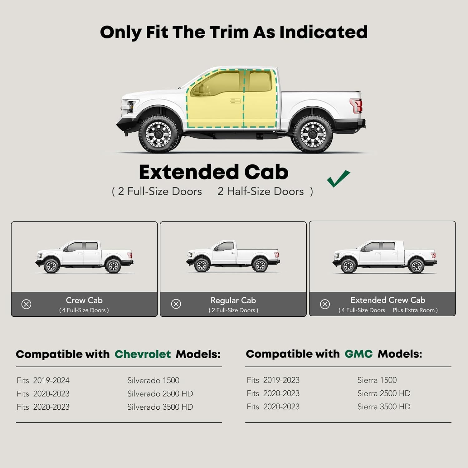 - Confident Fitment: Cab length side steps are compatible with the Chevrolet and GMC Models: Silverado/Sierra 1500 2019-2024, Silverado 1500 LTD/Sierra 1500 Limited 2022, Silverado/Sierra 2500 HD & 3500 HD 2020-2024, Extended Cab(2 Full-Size Doors with Half Doors)