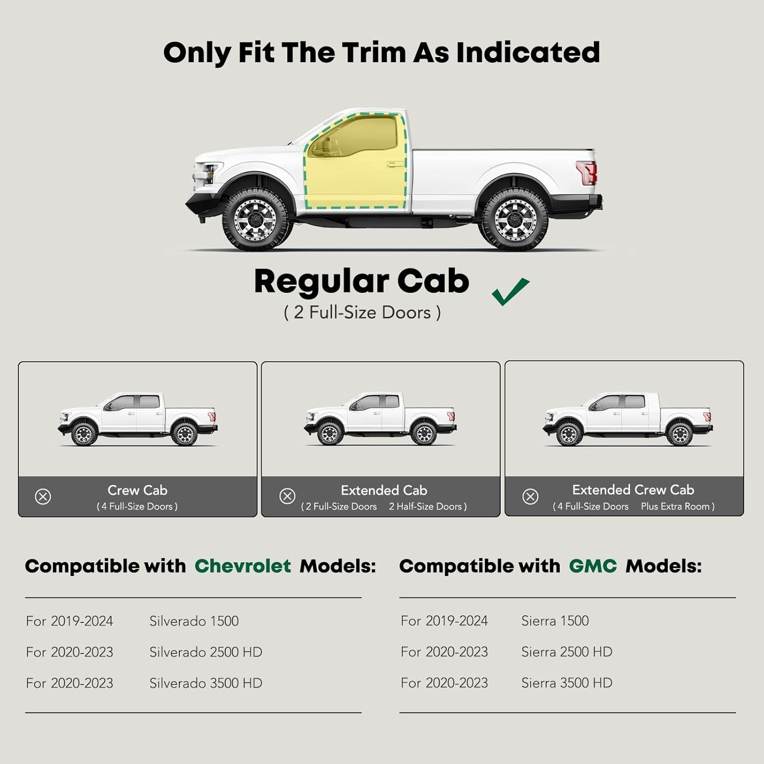 - Perfect Fit Side Bar: Our cab length running boards are fit for Chevrolet and GMC Models: Silverado/Sierra 1500 2019-2024, Silverado 1500 LTD/Sierra 1500 Limited 2022, Silverado/Sierra 2500 HD 2020-2024, Silverado/Sierra 3500 HD 2020-2024---Standard Cab/Regular Cab Pickup (2 Front Doors). YHTAUTO are committed to creating an all-around quality side bars that do more than just make it easy for you to get in and out of your car, or just complement the factory curves of your vehicles