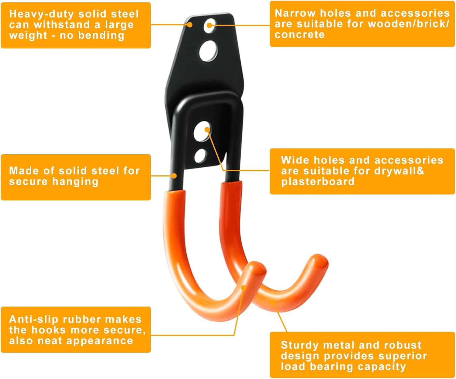 - PREMIUM QUALITY MATERIAL - Made of high-strength carbon steel and coated with a rust-resistant finish, our garage hooks heavy duty are built to last. They'll withstand the test of time and keep your garage or garden looking neat and organized for years to come. These storage hooks for garage wall are heavy duty garage hooks that you can rely on.