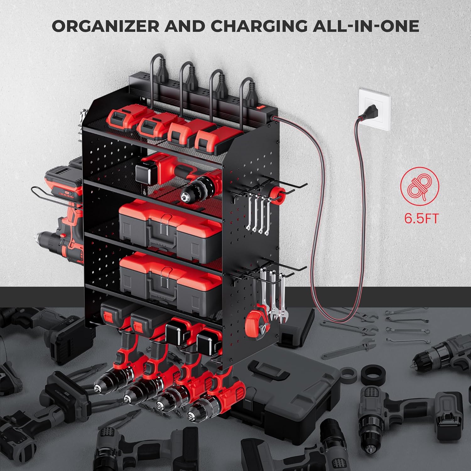 TRZZ Power Tool Organizer Wall Mount, 5-Layer Charging Station with 8 Outlets, 6 Drill Holders, 2 Side Pegboards, and Drill Bit Rack for Garage, Workbench, and Workshop (Black)