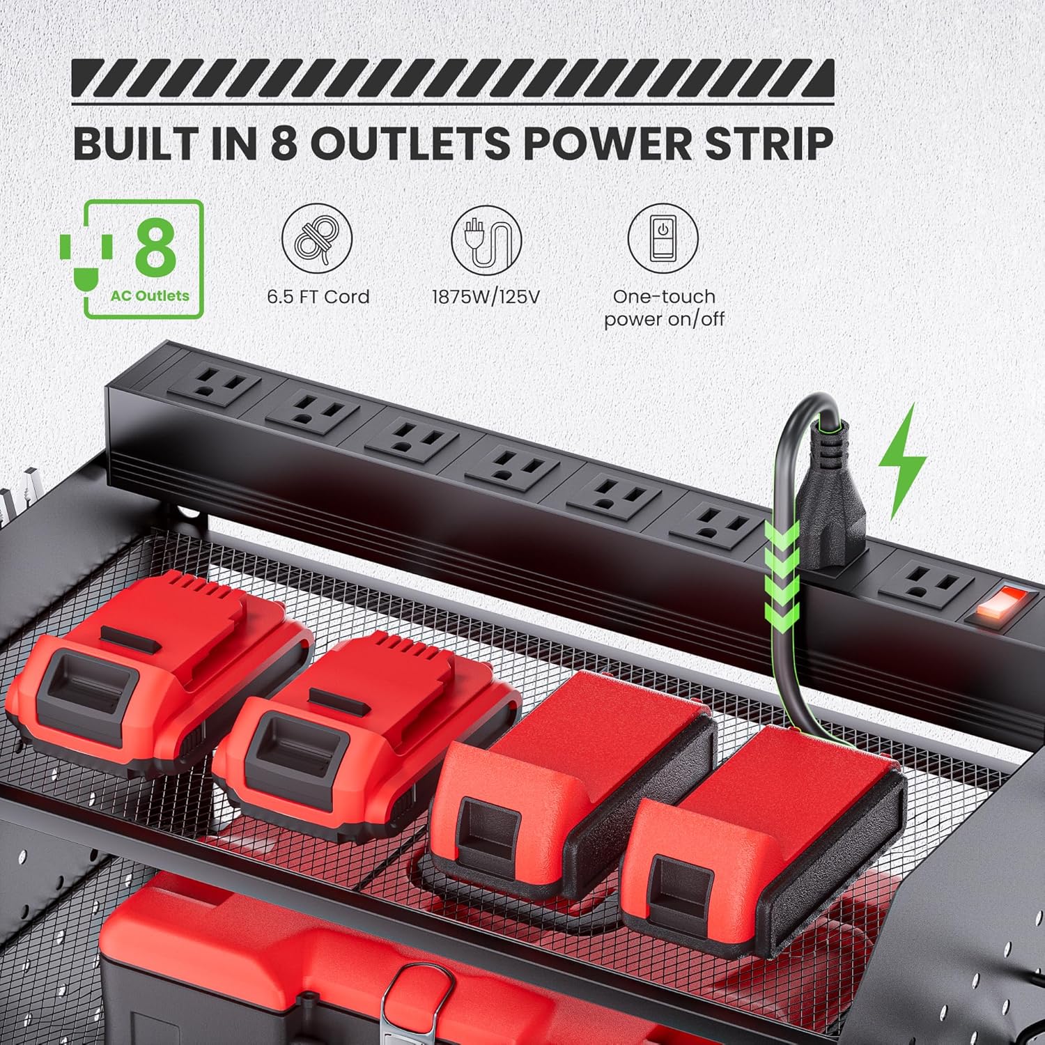 - Convenient for Charging Tools: 8 AC outlets, 6.5 ft 14AWG power cord included, output 125V/15A/1875W, power strip mounted 2 inches above the mesh shelf for space-saving, easy plugging and unplugging, and switching I/O buttons