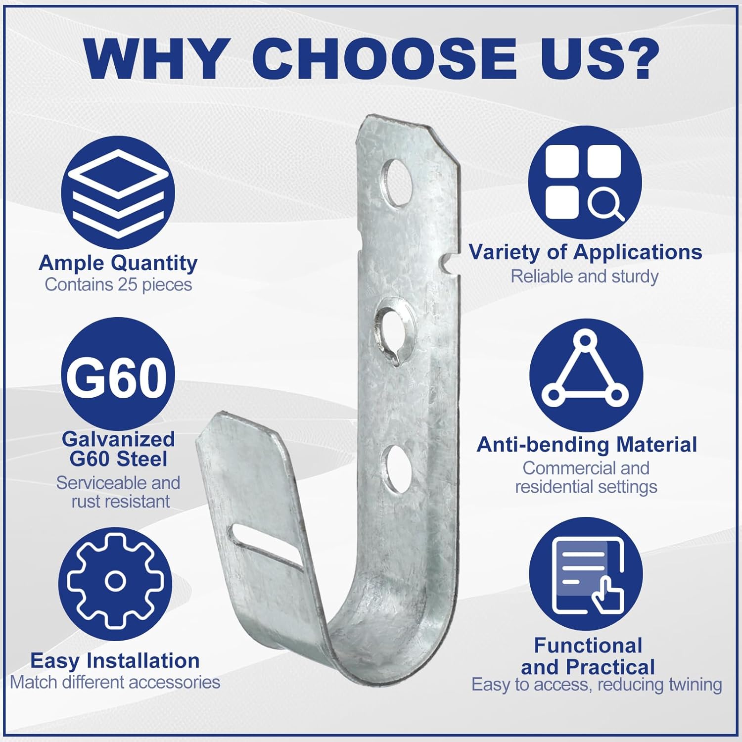 - Easy Installation: cable hooks wall are basic J hooks, and can match different accessories according to your needs; Our cable J hook is not only suitable for wall installation, but you can also easily install our wire retainer to the beam flanges