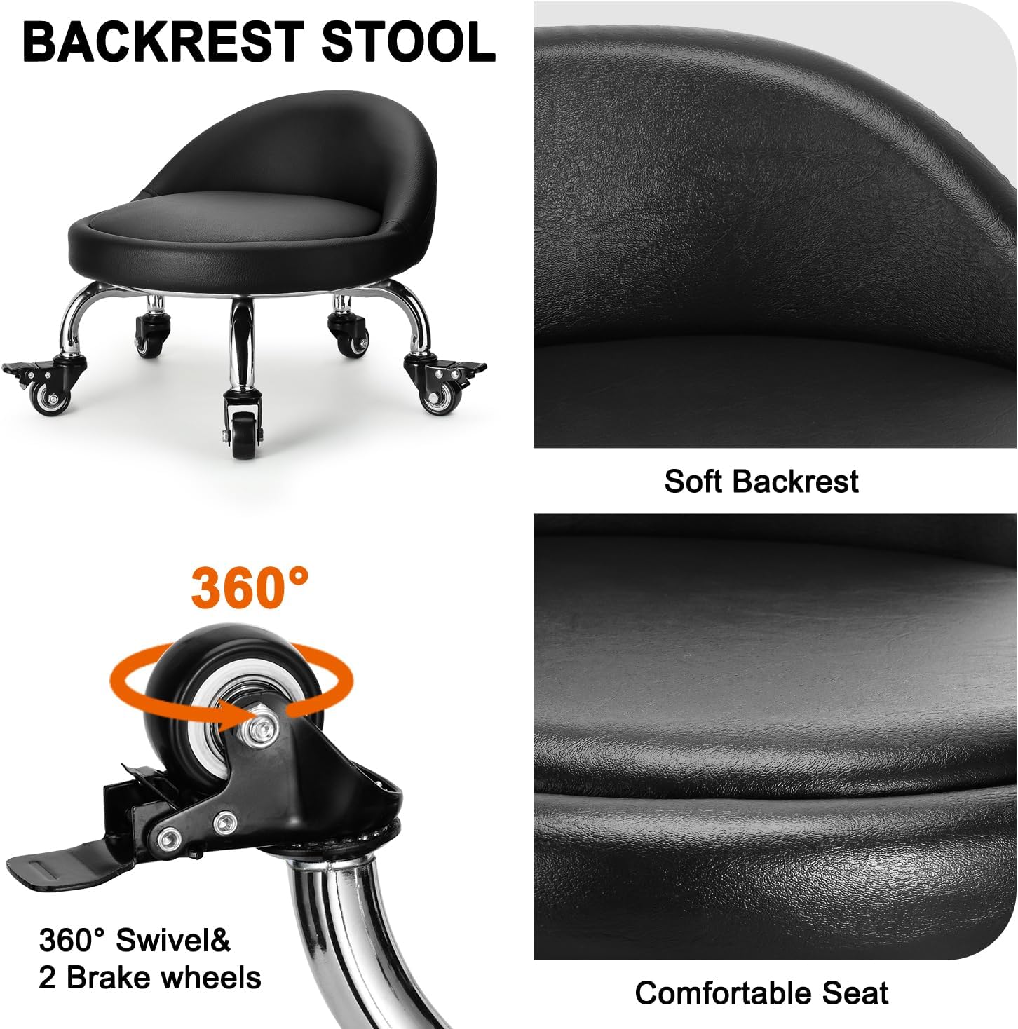 - ✨【High-Quality】Low rolling stool with backrest is made of PU leather material, which is waterproof durable and easy to clean. Soft and comfortable seat cushion and backrest, thickened sponge filling will feel comfortable during sitting. and restored prototype quickly when the weight depart.