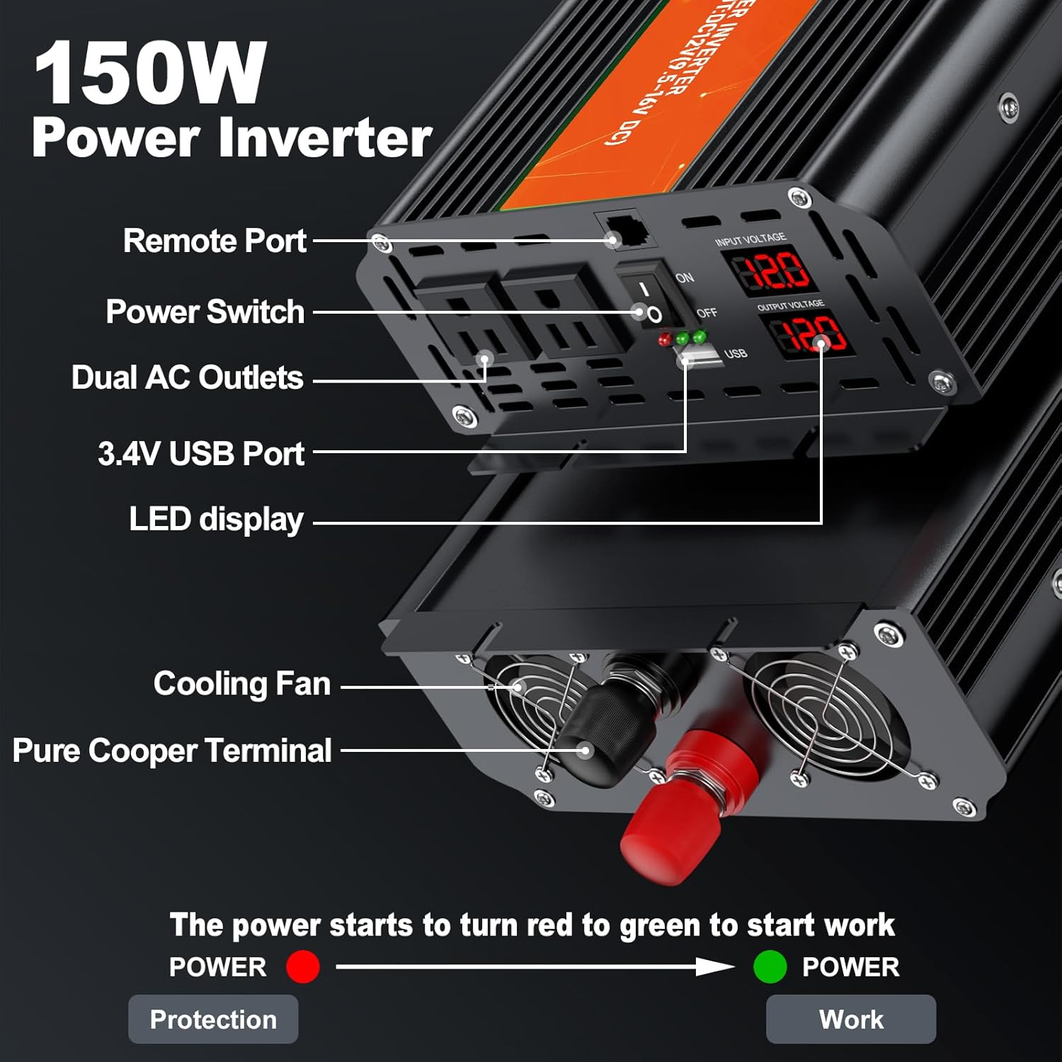 - 【Upgraded Version Low No-Load Consumption】True rated continuous 3000W and 6000W peak power. Convert DC 12V to 110/120VAC tech save more energy from high conversion efficiency (>90%) and low no-load loss. The inverter has 2 US standard 120V AC power outlets and a 2.4A USB fast charging interface, which can meet your various power needs.No load draws current 1士0.2A.