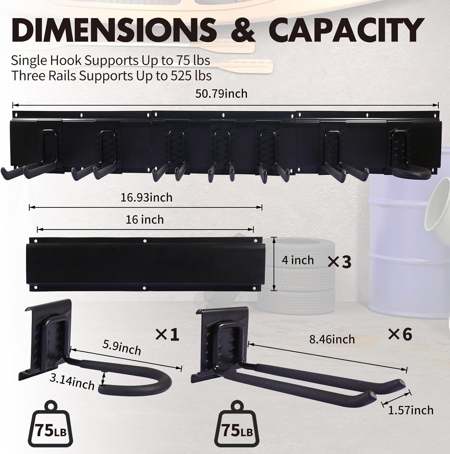 Garage Organization, 48 Inch Garden Tool Organizer Max Load 525 lb, Garage Tool Organizer Wall Mount with 7 Organization Hooks and Bike Hooks, Updated 16 Inch Studs Spacing