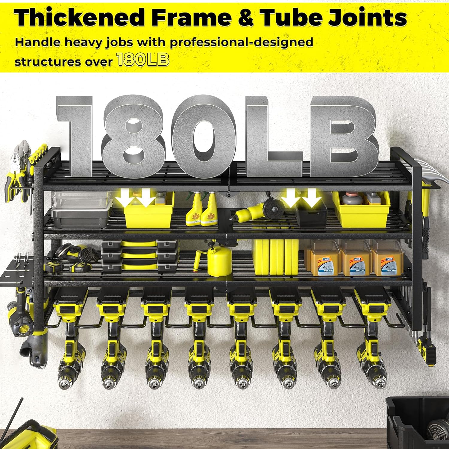- Extra Large: Elevate your workspace organization with the KAFAHOM 8-slot Power Tool Rack, boasting four tiers of spacious storage. The upper three tiers provide ample space for all your power tool accessories and miscellaneous workshop items, while the bottom tier features eight universal power tool slots, ensuring everything has its place.