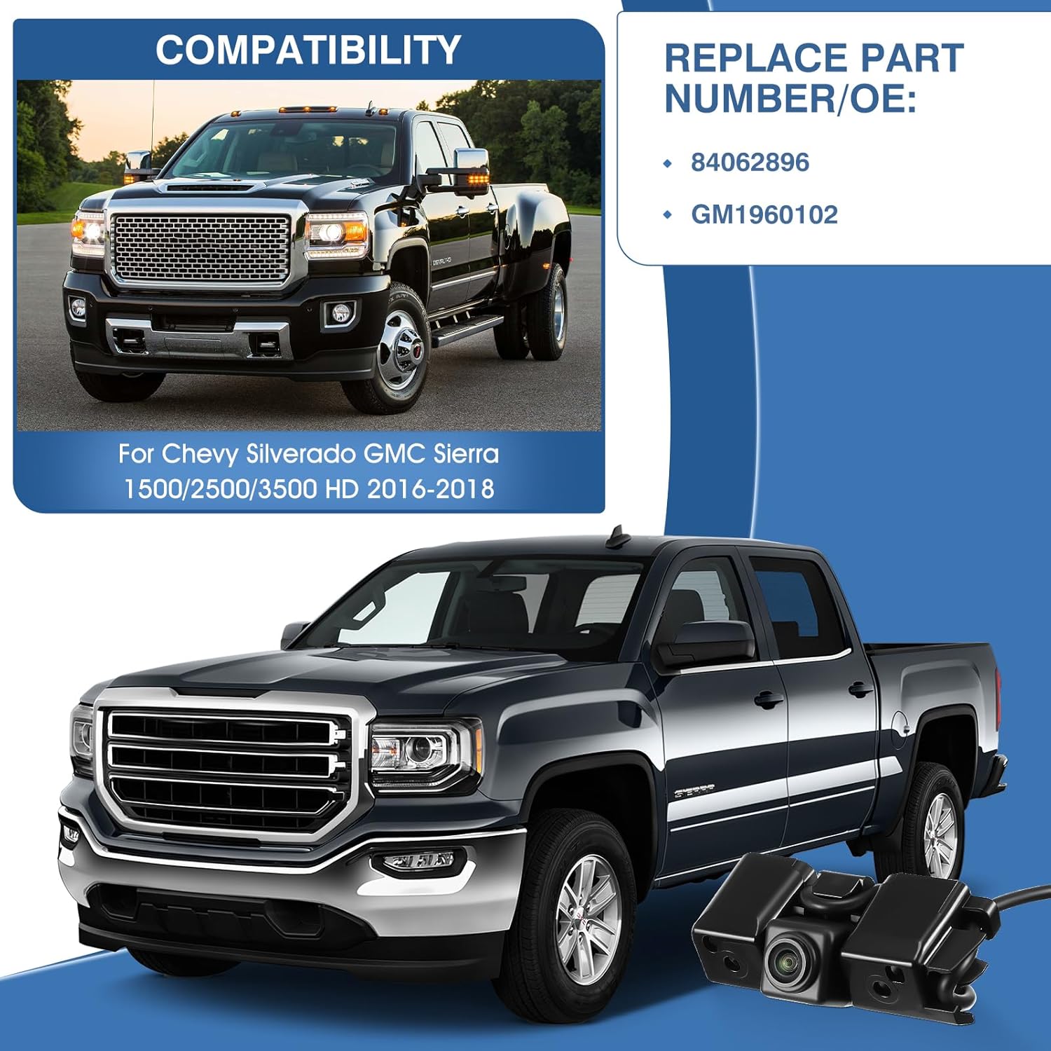 - [Compatible Model And Year]: This Rear View Backup Camera is fit for Chevy Silverado 1500 HD 2500 HD 3500 HD 2016-2018,fit for GMC Sierra 1500 HD 2500 HD 3500 HD 2016-2018; Please check the fitment via amazonconfrimfit and your local dealer before purchasing.