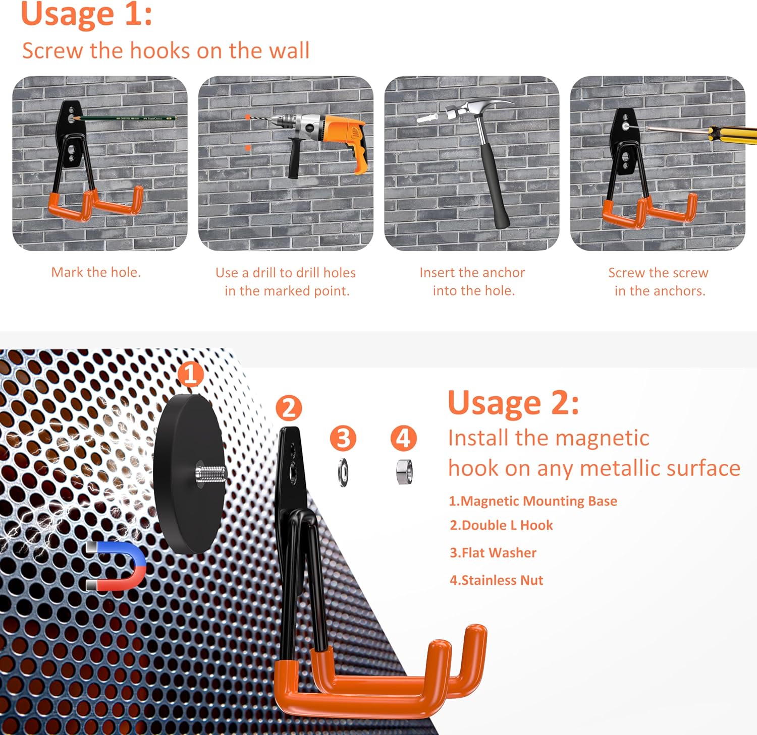- 4 pcs magnet hooks for hanging: The magnet hooks are ready for use on any steel surfaces you already have in the garage, fridge, garden, workshop, container, barn, shed, tool chest, work van, or outdoor.