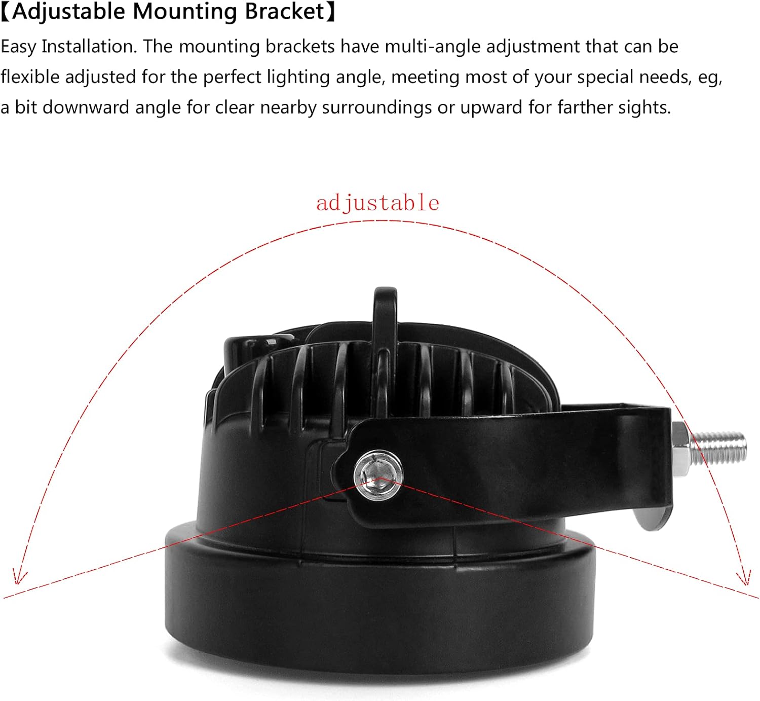 - 【Adjustable Mounting Bracket】 Easy Installation. The mounting brackets have multi-angle adjustment that can be flexible adjusted for the perfect lighting angle, meeting most of your special needs, eg, a bit downward angle for clear nearby surroundings or upward for farther sights.