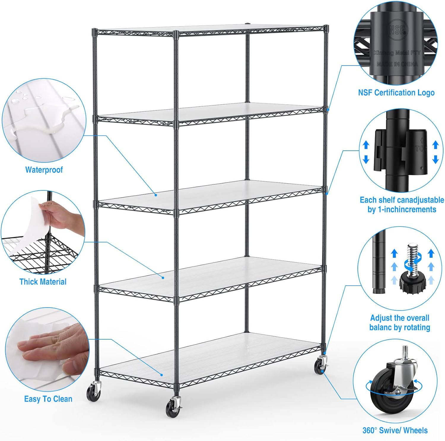 - STURDY & EXTREMELY DURABLE - Wire shelving made of heavy steel, it has excellent rust resistance and oxidation resistance. Our wire shelf liner is crafted to provide unparalleled quality, longevity, function and beauty. Better quality thicker than the competition. The 5 tier shelf unit passed NSF certified, safe and reliable. Storage rack are perfect addition to home, office, garage.